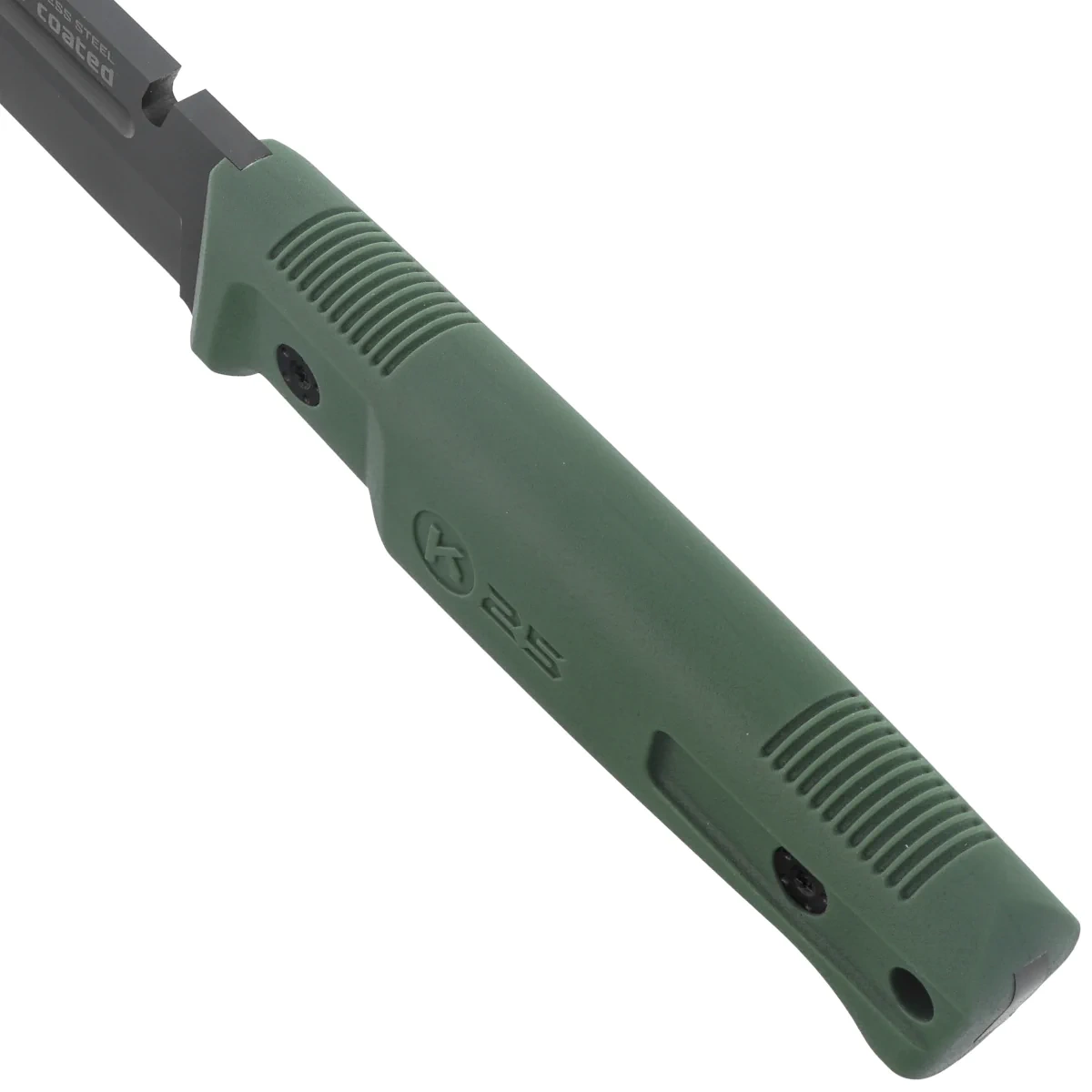 RK-32756 Green Rubber, Titanium-Coated from the K25 brand is a classic tactical knife designed for field use where reliability, ergonomics and material resistance are important. The fixed blade made of 4Cr13MoV stainless steel , coated with Black Titanium, offers increased protection against corrosion and reduces light reflections - a key aspect in tactical conditions. Thanks to its well-thought-out blade geometry and robust grind, the model performs well in both precision tasks and heavier field applications. The textured black rubber Handle provides a secure grip even in wet environments, and the sturdy construction translates into increased rigidity and resilience of the entire tool. The balance and anatomical shape of the grip promote comfort during prolonged use. The whole is complemented by a black nylon sheath, offering quick access and safe carrying. This is a proposition for people who need a rugged outdoor knife with a distinctly tactical character - ready to operate in any field conditions.