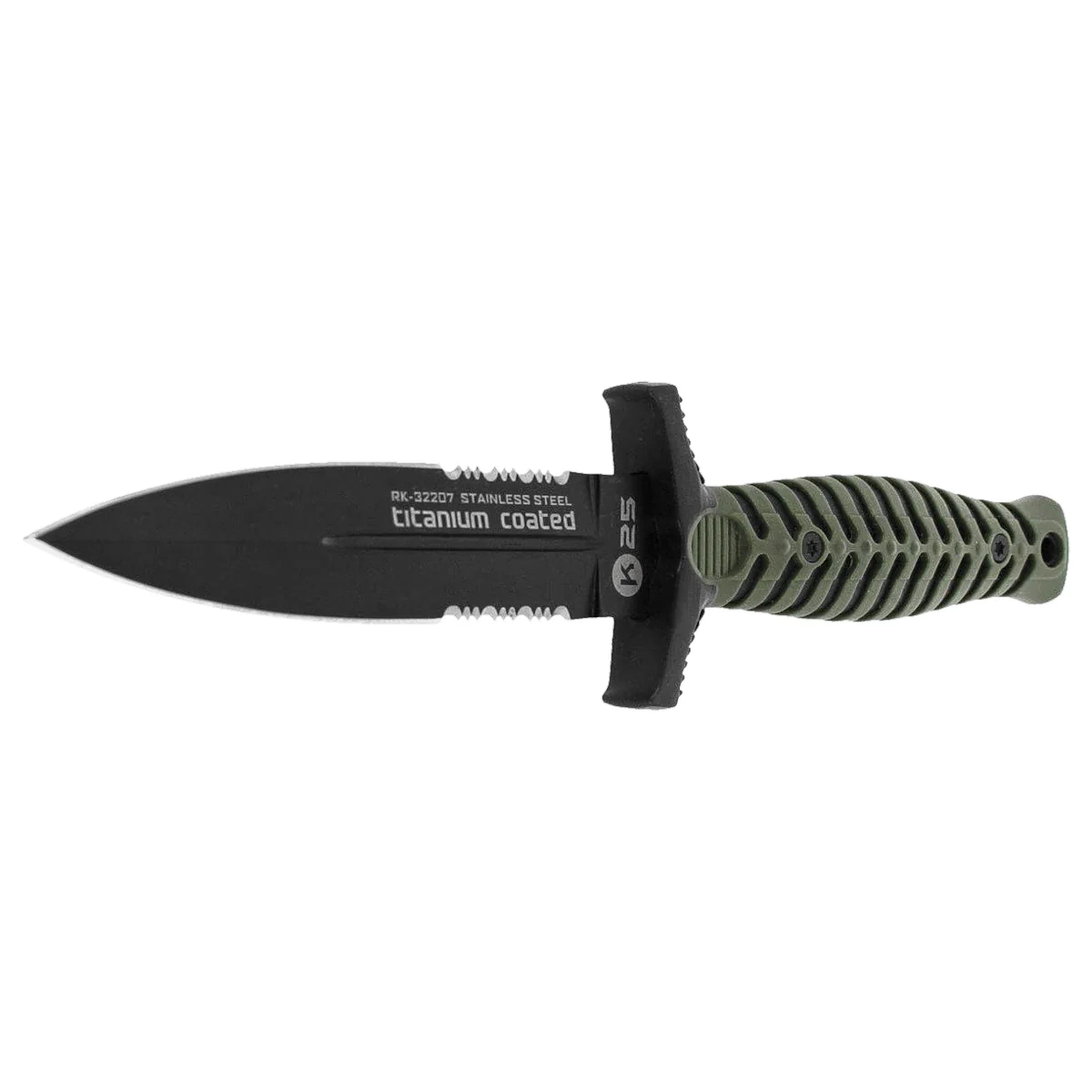 - RK-32207 Tactical Green ABS/Black Rubber, Black Titanium - a compact boot knife by K25 with a Black Titanium coated dagger blade and rubberized ABS handle. It comes with a Quick Release nylon sheath.