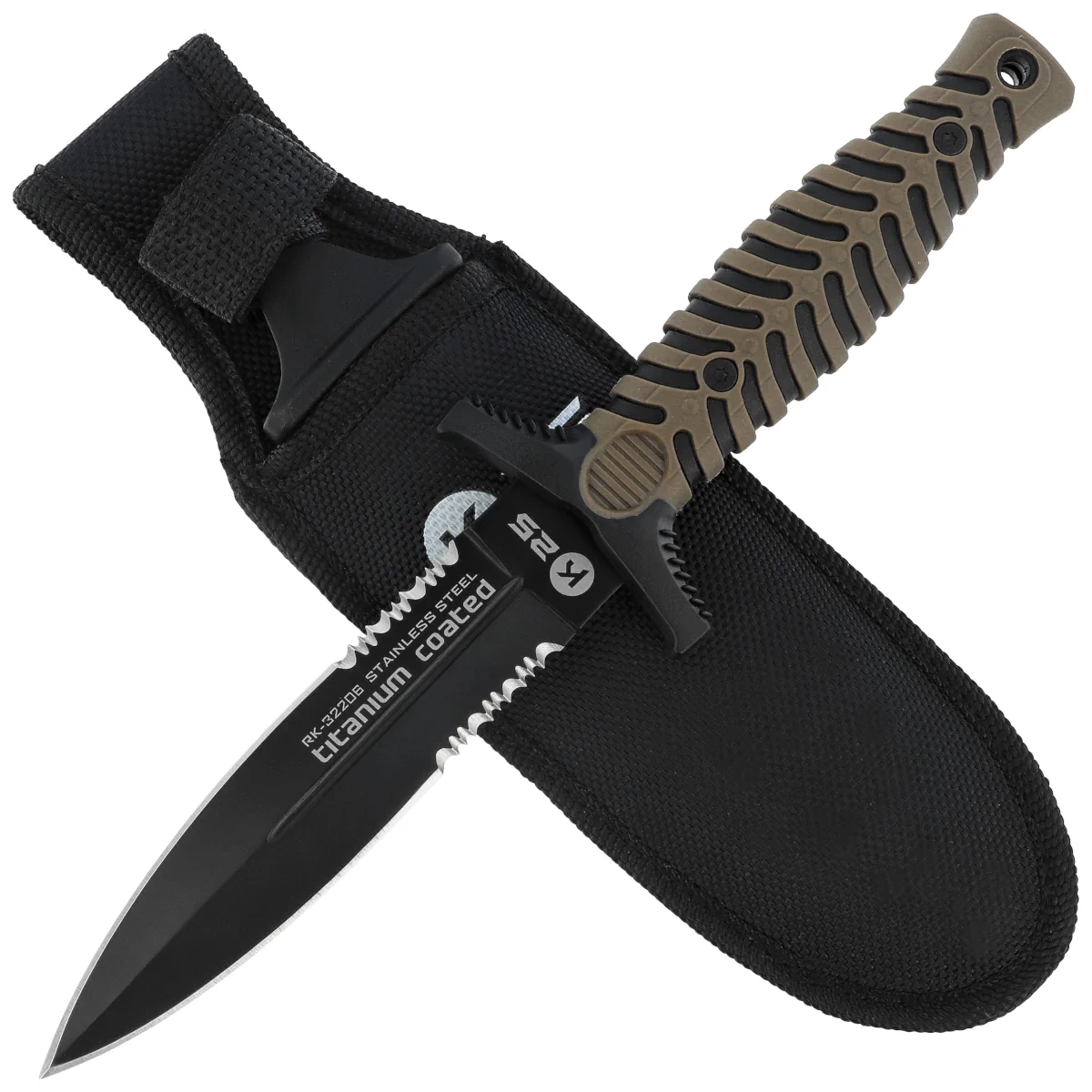 - RK-32206 Tactical Coyote ABS/Black Rubber, Black Titanium - compact boot knife by K25 with Black Titanium coated dagger blade and rubberized ABS handle. It comes with a Quick Release nylon sheath.