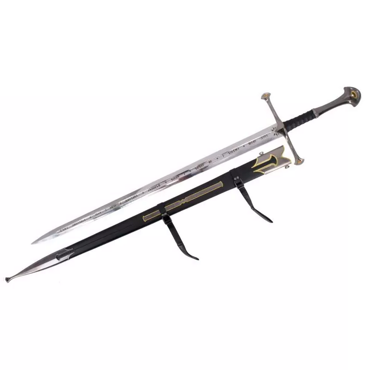 Handle and Scabbard – The hilt features nickel and gold-toned accents that complement the ornamental guard, adding a refined touch to the replica. It comes with an elegant scabbard made of black leather-like material, adorned with nickel and gold elements and a decorative rune plate at the seam.