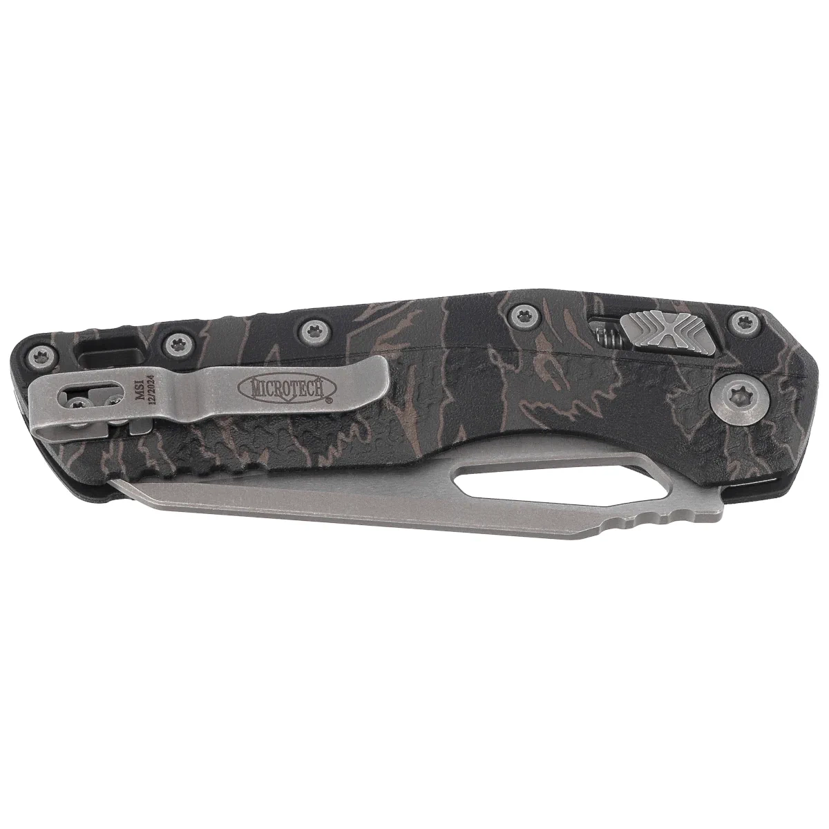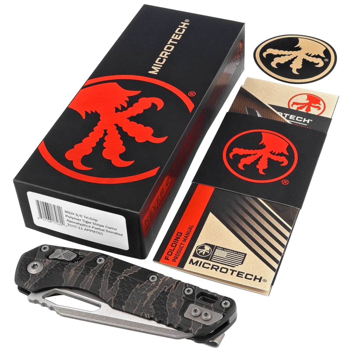 MSI S/E Ram-Lok Tiger Stripe Camo Tri-Grip Polymer, Apocalyptic P/S folding knife that combines strength, durability and elegance. Its blade is made of excellent M390MK steel , which is the result of cooperation between two renowned companies - Microtech and Böhler. This steel is known for its exceptional strength and long sharpness retention, making this knife unafraid of any challenge. The intuitive RAM-Lok ensures safety during use. This innovative lock is easy to operate and provides ease of use for both right and left-handed people. The Handle of the knife is made of polymer, durable and ergonomic. Its shape is designed to fit perfectly in the hand, ensuring comfort even during prolonged use. This knife is not only a tool, but also a work of applied art. Its designer, Anthony Marfione, founder and owner of Microtech, has taken care of every detail. From the elegant black finish to the satin details, this knife is both beautiful and practical. Whether you're looking for a reliable tool or an elegant accessory, MSI (Microtech Standard Issue) knife will meet your needs.