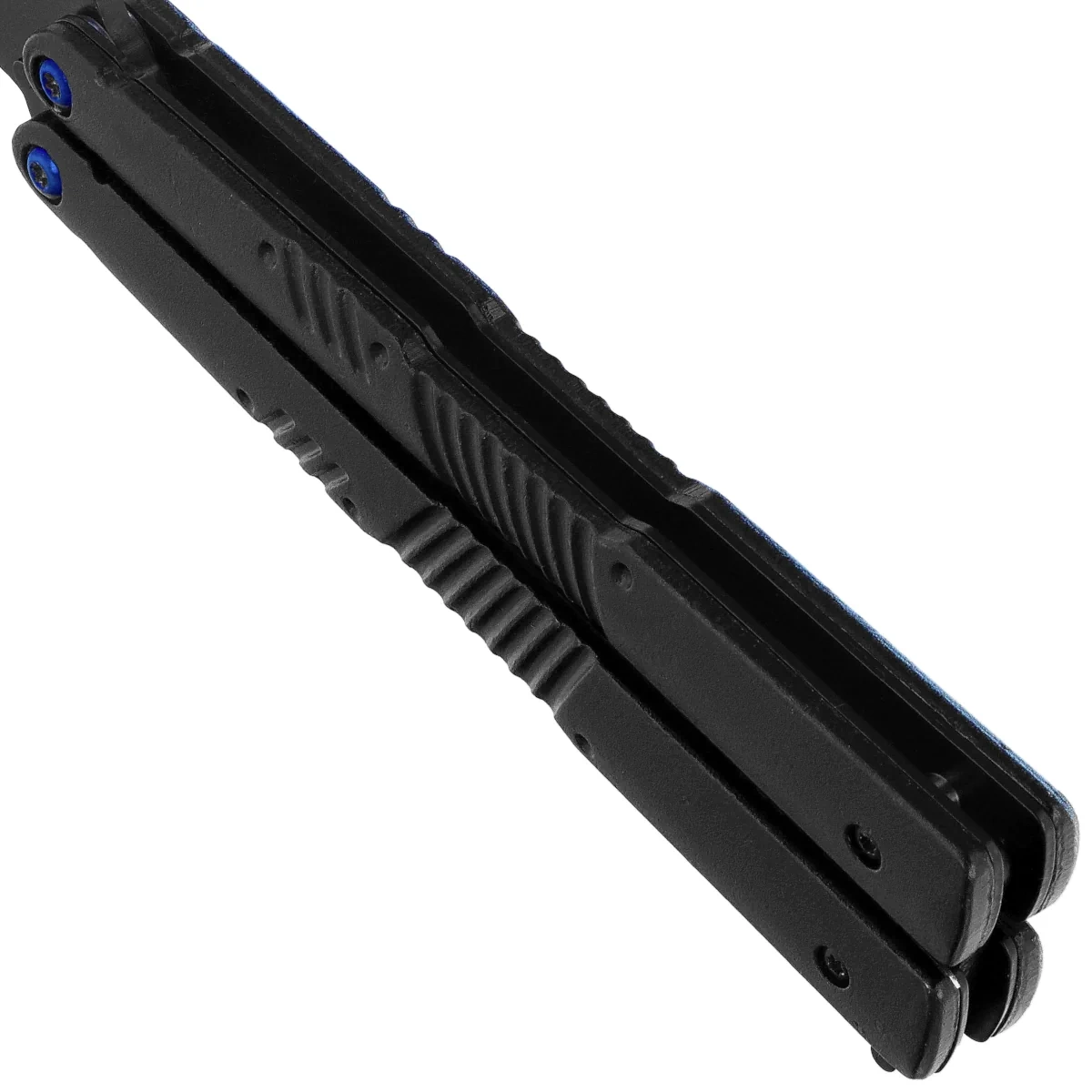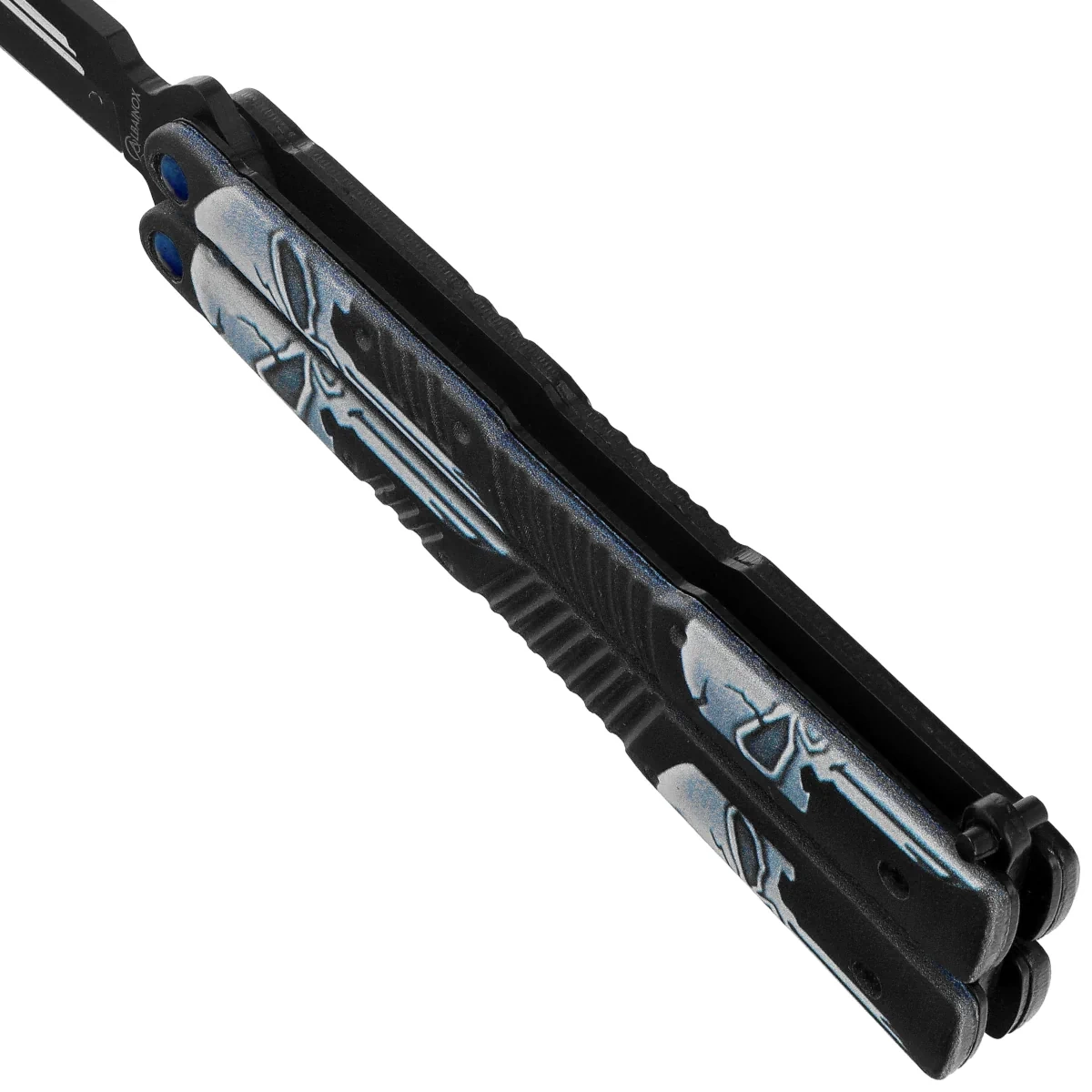 • Balisong Skulls Black Aluminum, Black 3Cr13Mov (02201) - a distinctive butterfly knife with dagger blade, blackened 3Cr13Mov steel and skull print. Striking design, durable construction, dynamic handling.