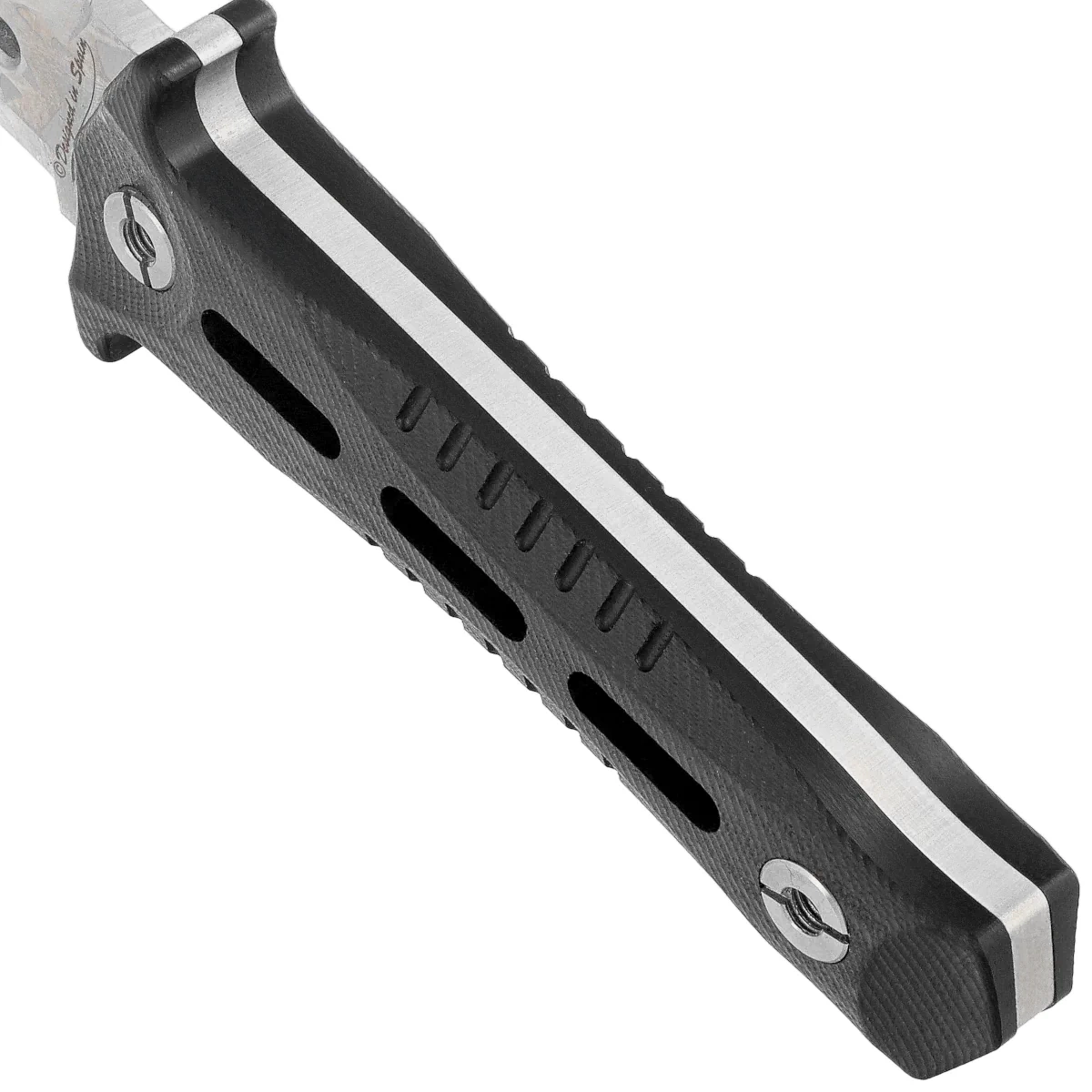 Handle - made of G10 composite, providing a non-slip grip and resistance to dirt and abrasion. Ergonomic profiling improves the comfort of use, reducing hand fatigue during prolonged operations. The sheath comes complete with a black nylon she ath with Quick Release system and the ability to attach to a belt or a holster. This practical, modern design meets the needs of users operating in stressful conditions, requiring quick access and maximum functionality.