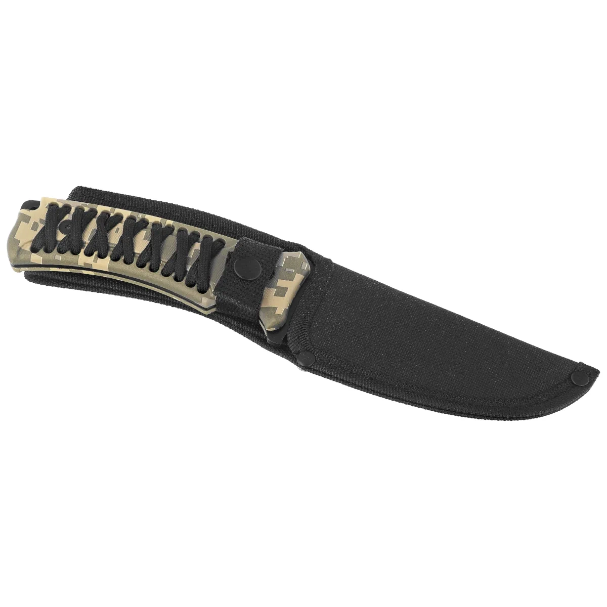 - 32795 ABS Camo/Black Stringing, Black, tactical knife with drop point Blade made of 3Cr13Mov steel, ABS plastic Handle with paracord braiding, equipped with ballistic nylon pouch. An effective outdoor tool with military character.