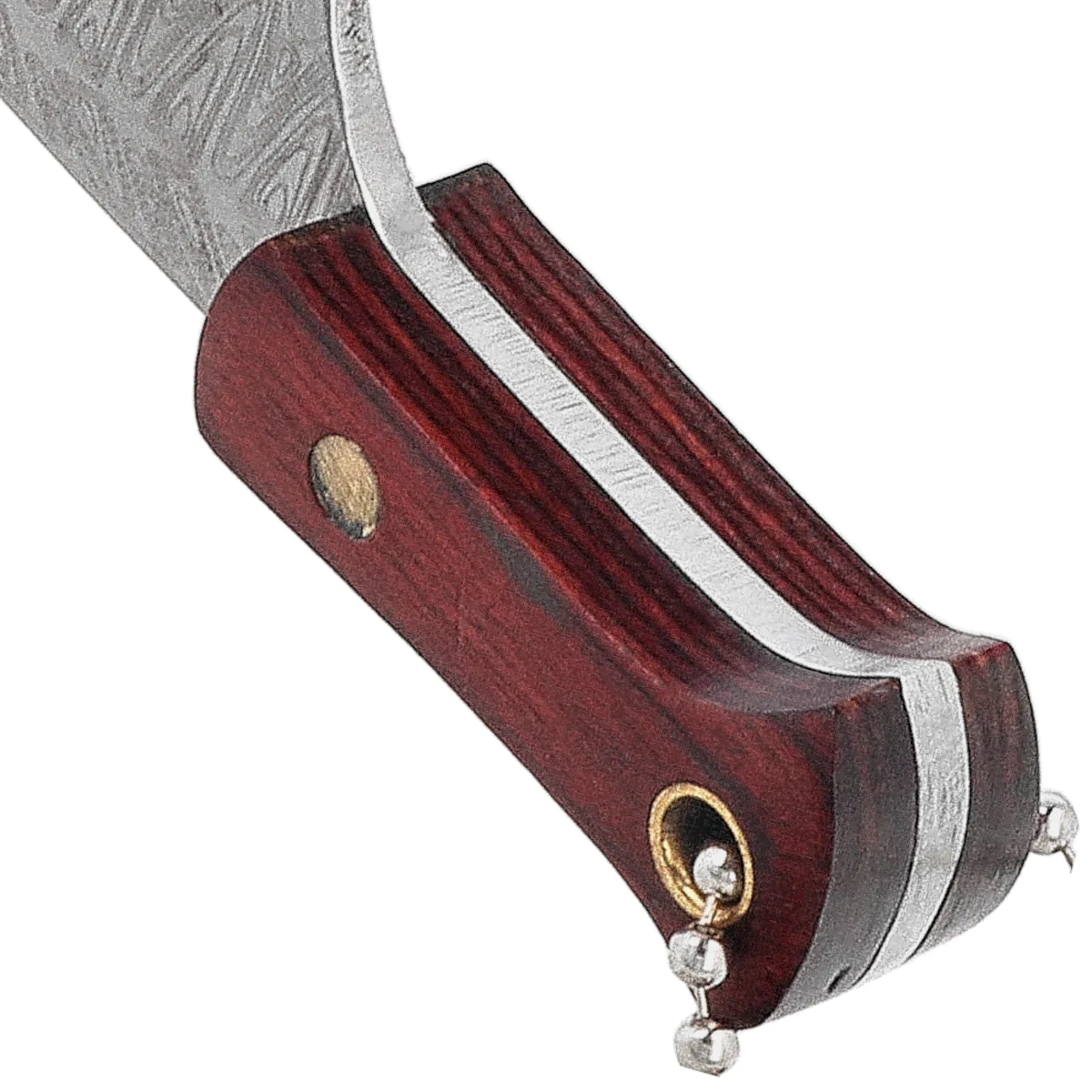 The 32767 from Martinez Albainox is a compact keychain knife designed for users looking for a stylish and practical addition to their daily EDC equipment. Despite its compact size, it offers all the functionality needed for small tasks - from cutting lines to opening packages. It's a solution that combines aesthetics with utility in a condensed form. Blade made of 3Cr13Mov stainless steel is covered with a decorative pattern imitating Damascus, which gives it a noble character without affecting the performance. The pattern enriches the blade visually, emphasizing its collector's potential and referring to classic techniques of decorating the blade. The natural wood Handle features a simple, ergonomic form that provides comfortable grip even with the limited length of the knife. The brass pin and precise finish give the whole thing a classic look. The set comes with a leather case with a snap closure and a ball chain, so the knife can be conveniently clipped to your keys, bag or outdoor equipment. This miniature folder is a practical ornament and handy tool in one - for lovers of detail, classics and everyday functionality.