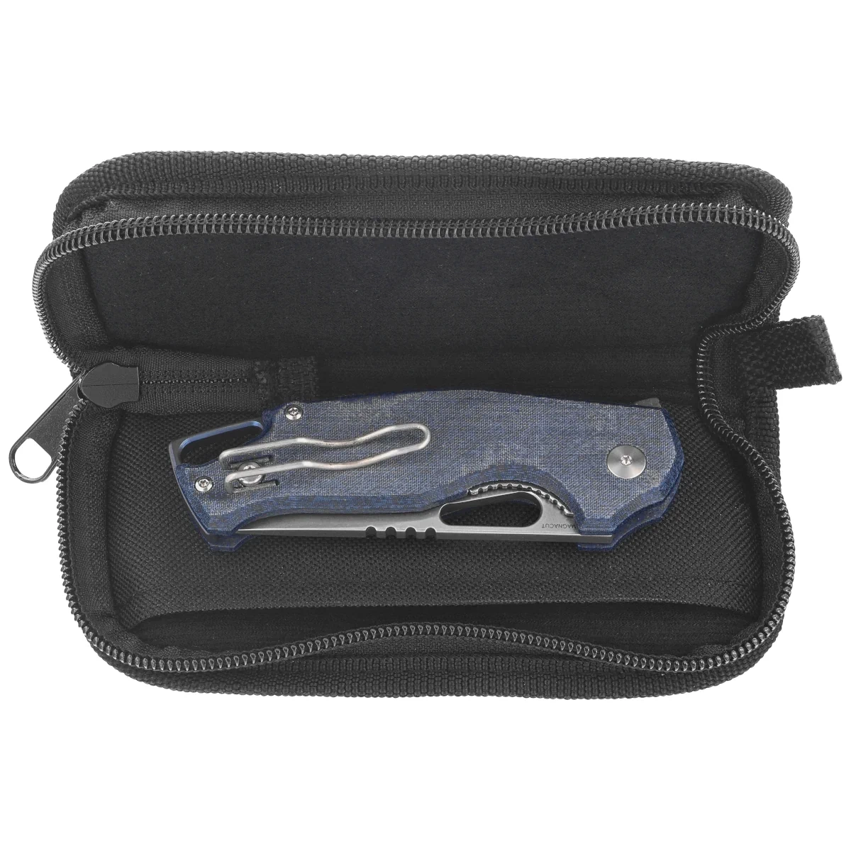 Case - the knife is packed in a zippered soft nylon case with the brand's logo. It is used for safe storage and transportation of the folder.