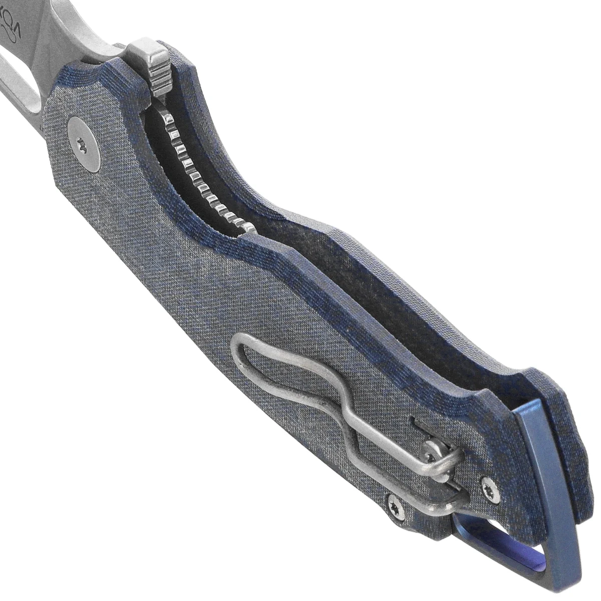 Handle grips - grips made of slightly rough Micarta, a composite of pressure-pressed canvas with synthetic resin. The grips were screwed to a CNC-milled titanium backspacer, such a solution provides the desired rigidity of the structure. Double-sided (right/left) deep-carry clip , allows to carry the knife discreetly in tip-up position (blade tip up). A protruding section of the backspacer creates a lanyard hole, a hole for a rope, and can also be used as an improvised glass breaker.