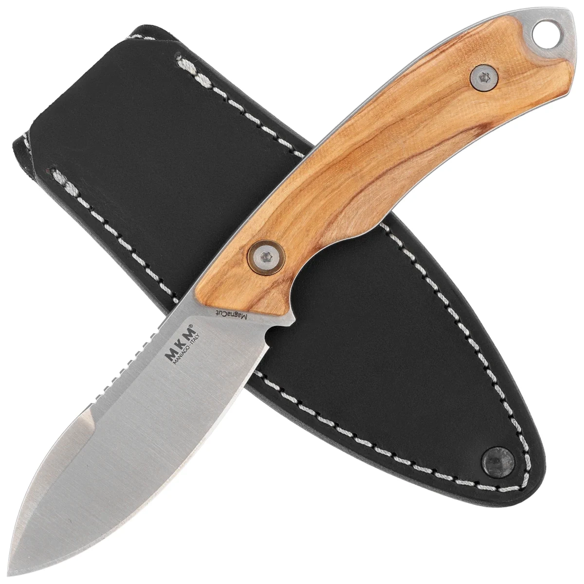 Pocket Tango 1 Olive Wood, Satin is an advanced fixed blade knife designed by David C. Andersen with maximum functionality, durability and functional aesthetics in mind. Created by the Italian brand MKM, known for its combination of craftsmanship, modern technology and excellent materials, the Pocket Tango 1 model is a tool that will prove its worth both in everyday EDC use and during precision field tasks. Blade is made of elite CPM MagnaCut steel , combining excellent corrosion resistance with excellent edge retention and high mechanical resistance. The satin finish gives the blade an elegant character and reduces the visibility of micro-scratches, highlighting the class of the materials used. The blade's geometry and profile are conducive to tasks requiring accuracy and precise control, even under more difficult conditions. The Handle is made of olive wood, precisely shaped for ergonomics and grip confidence. The textured surface provides grip even with wet hands, while rounded edges and finger cutouts promote comfort during prolonged use. Full tang construction , a place for a rope and the included natural leather sheath with magnetic safety make the Tango 2 model a complete, reliable tool - ready to work in all conditions. This is an option for those who appreciate high quality workmanship, functionality and classic style without compromise.