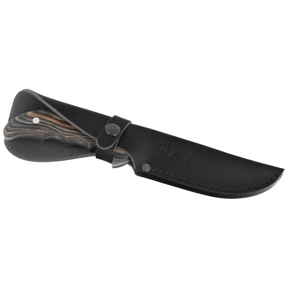 Handle - made of Evergreen Pakka Wood - Pakka wood laminate is not only an aesthetic, but also a functional choice - this material is light, durable and resistant to changing weather conditions. Grips with a beautiful grain pattern have been solidly set with nickel pins, which ensures durability and reinforces the classic look. The ergonomically shaped profile with deep finger indentations ensures grip stability and comfort for extended use. The whole design is complemented by a sheath made of thick cowhide, fastened with a snap and adapted for vertical belt mounting. The OUTDOOR-12M Handle is an example of refinement of function and aesthetics - classic design meets practical, off-road utility here .