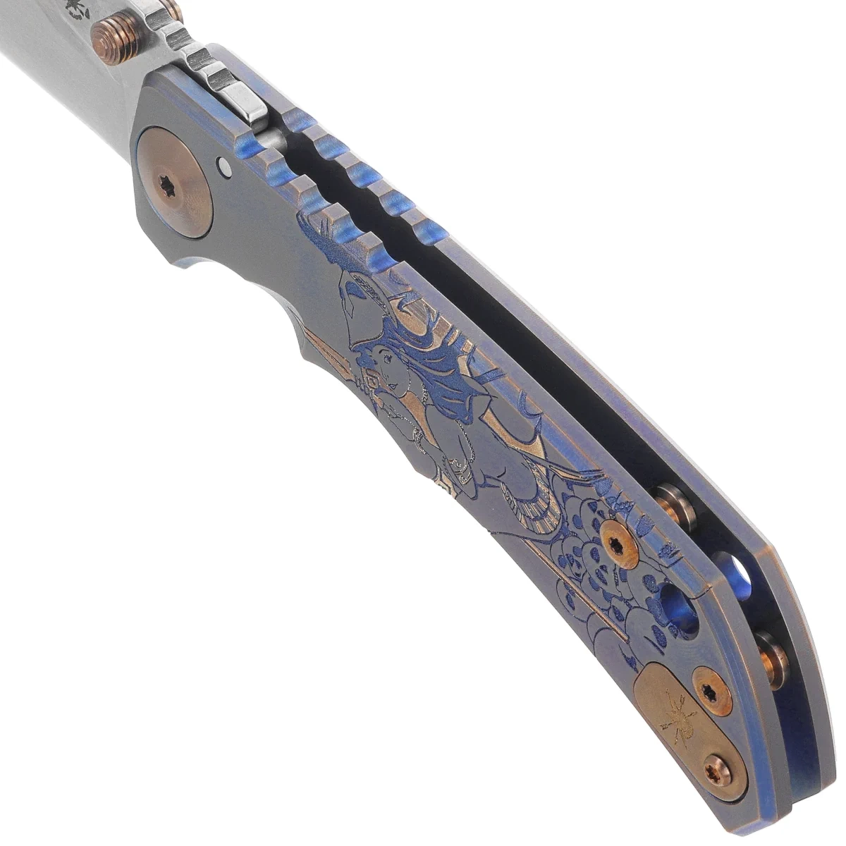 Handle - made of solid titanium 6AL4V has beveled edges of the covers, eliminating sharp points. The surface is decorated with an artistic engraving depicting a young girl. The so-called open-backed design without the typical backspacer, attached with titanium spacer sleeves for easy cleaning. The simple but sturdy design guarantees many years of use. There are notches (jimping) on the edges of the Handle, improving grip security. The axis of the pivot is decorated with a designer screw, and all fasteners (screws, clip) are anodized blue. A double-sided (right/left) titanium clip, decorated with an arrow motif, allows the knife to be carried in tip-up position. Above the clip is a hole designed for threading a safety cord.