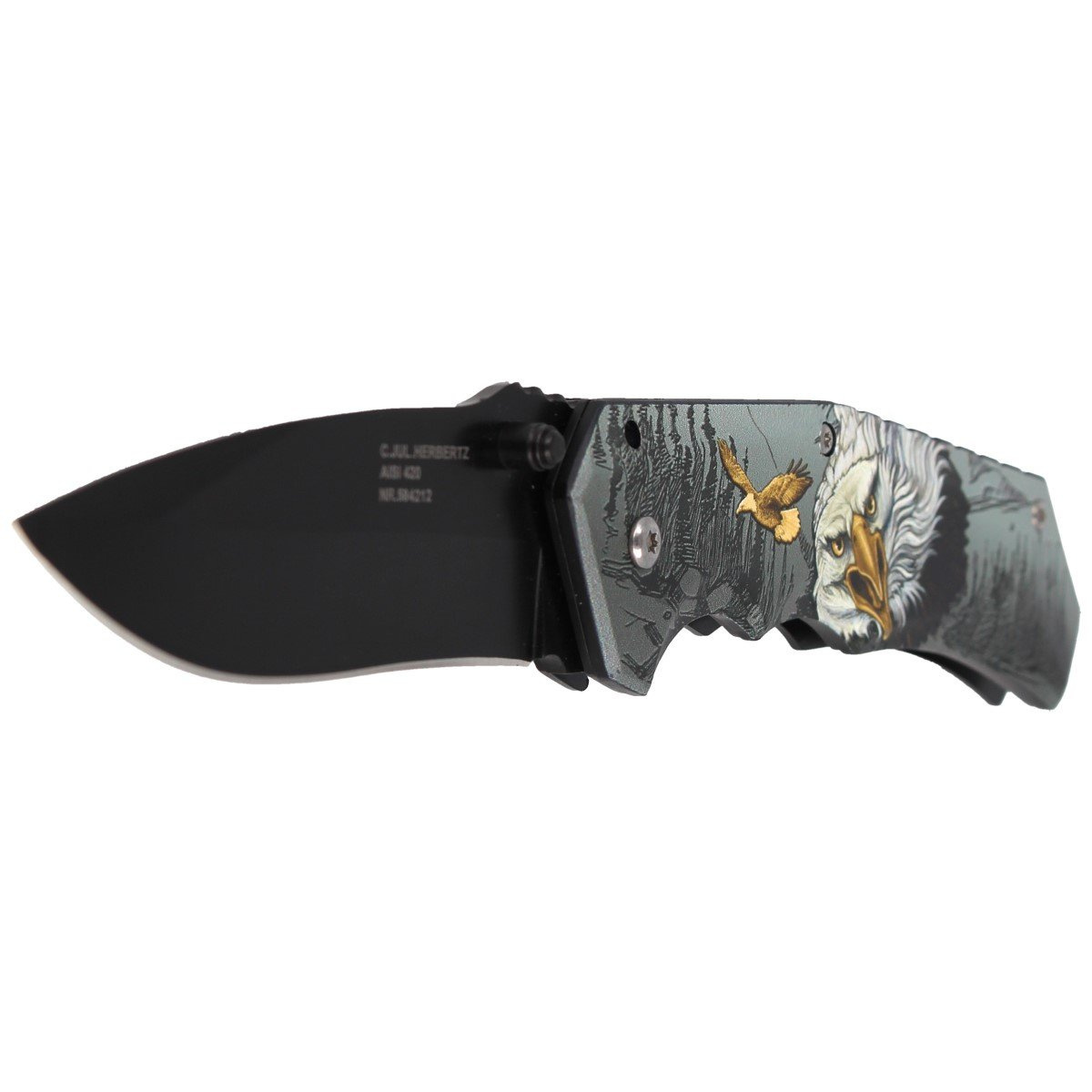 • Herbertz CJH 3D Eagle, Black - a folding utility knife with a 420 stainless steel drop point blade with black coating and a metal handle with decorative eagle graphics. 3D aesthetics and functionality in a rugged EDC design.