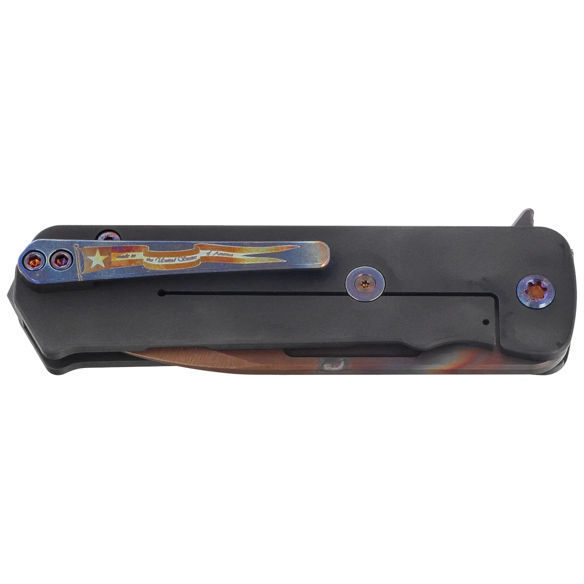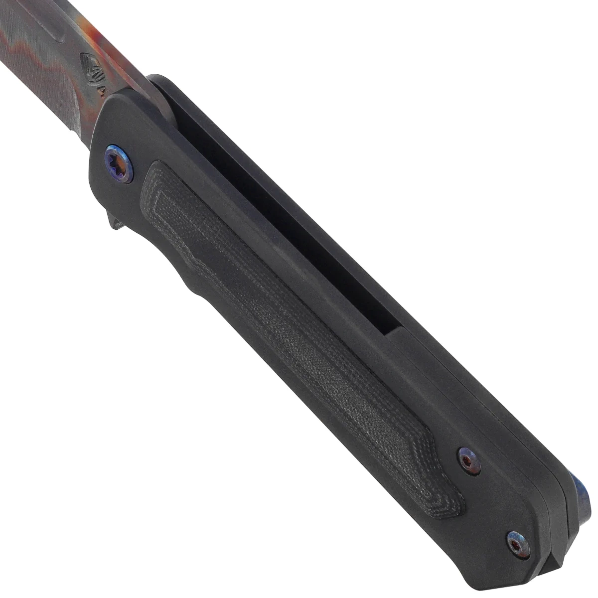 Handle - a combination of titanium and G10 composite inlays, which provides both high mechanical resistance and improved grip in the hand. The texture of G10 improves the control of the tool in difficult conditions, and its low weight has a positive effect on the balance of the entire structure. The entire design has been fused together with flame-dyed screws, which harmonize with the titanium clip with a blue-purple finish. The deep carry clip allows the knife to be carried discreetly and securely. The Handle was designed for users expecting maximum functionality and aesthetics at the highest level.