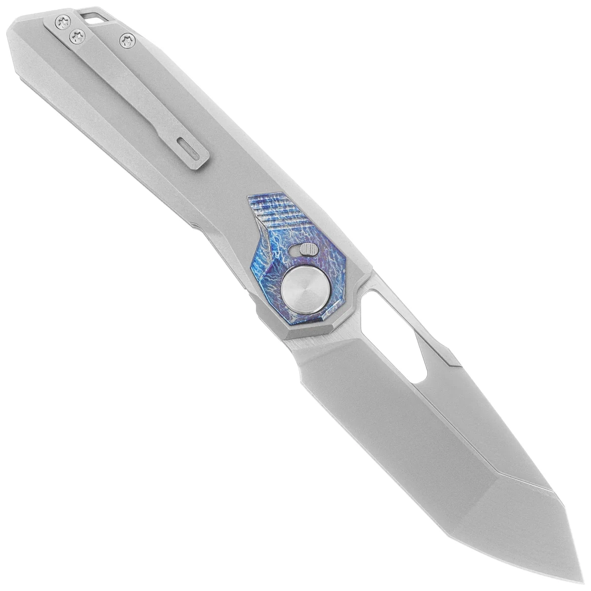 Peregrine Falcon Gray / Thunder Lightning Titanium, Hand Grinding Pearlescent, an exceptional EDC folder that combines excellent functionality with unique style. Hand-ground reverse tanto blade with pearlescent sheen. Front Flipper quick flipper that allows you to instantly open the knife with one hand, it can also be opened with a hole in the blade. This is especially useful in situations where every second counts. The lightweight and durable titanium Handle adds both elegance and resilience. Equipped with an innovative and intuitive Button Liner Lock, which allows you to safely fold the knife while keeping your fingers away from the blade. This version features an additional lock to prevent accidental opening or closing of the knife. The Remette Peregrine Falcon is more than just a tool - it's a statement of personal style and passion. Its compact size makes it easily fit in any pocket, and its quality workmanship and unique design are sure to attract attention.