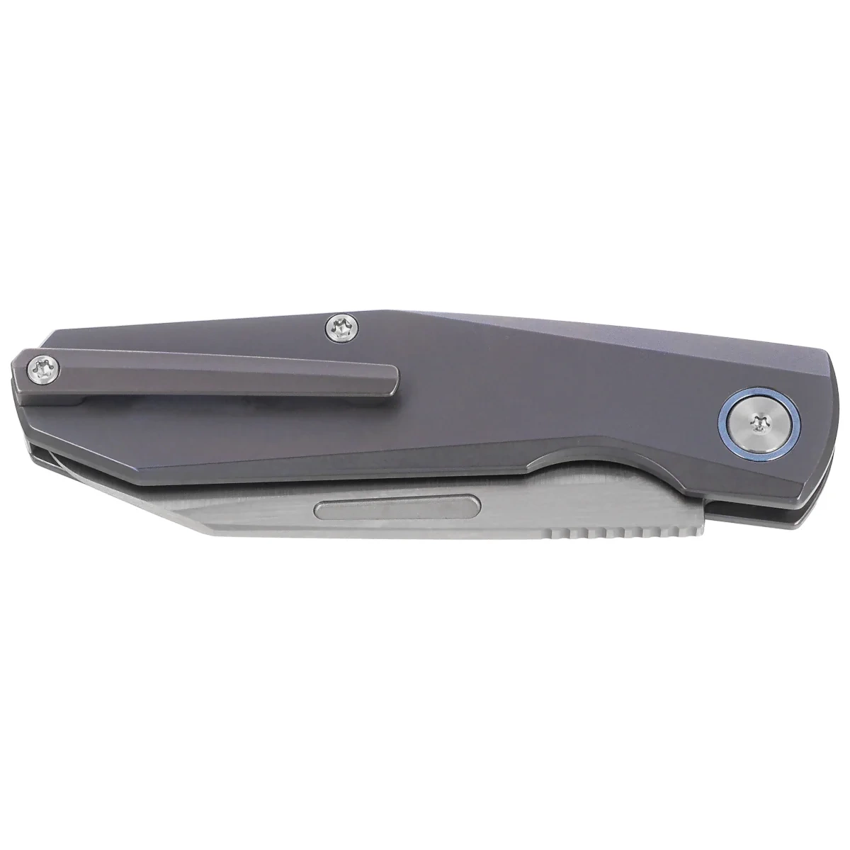 Handle - milled from 6AL4V titanium , thermally colored blue. Open back profile design allows for easy maintenance and reduced overall weight. Ergonomic contouring under the index finger and slim geometry provide comfort and precision grip. The symmetrical deep carry clip on both sides allows for low-profile pocket carry of the knife without interfering with the design styling. Accents such as the anodized pivot ring emphasize the modern, austere nature of the design, where functionality goes hand in hand with minimalist design.