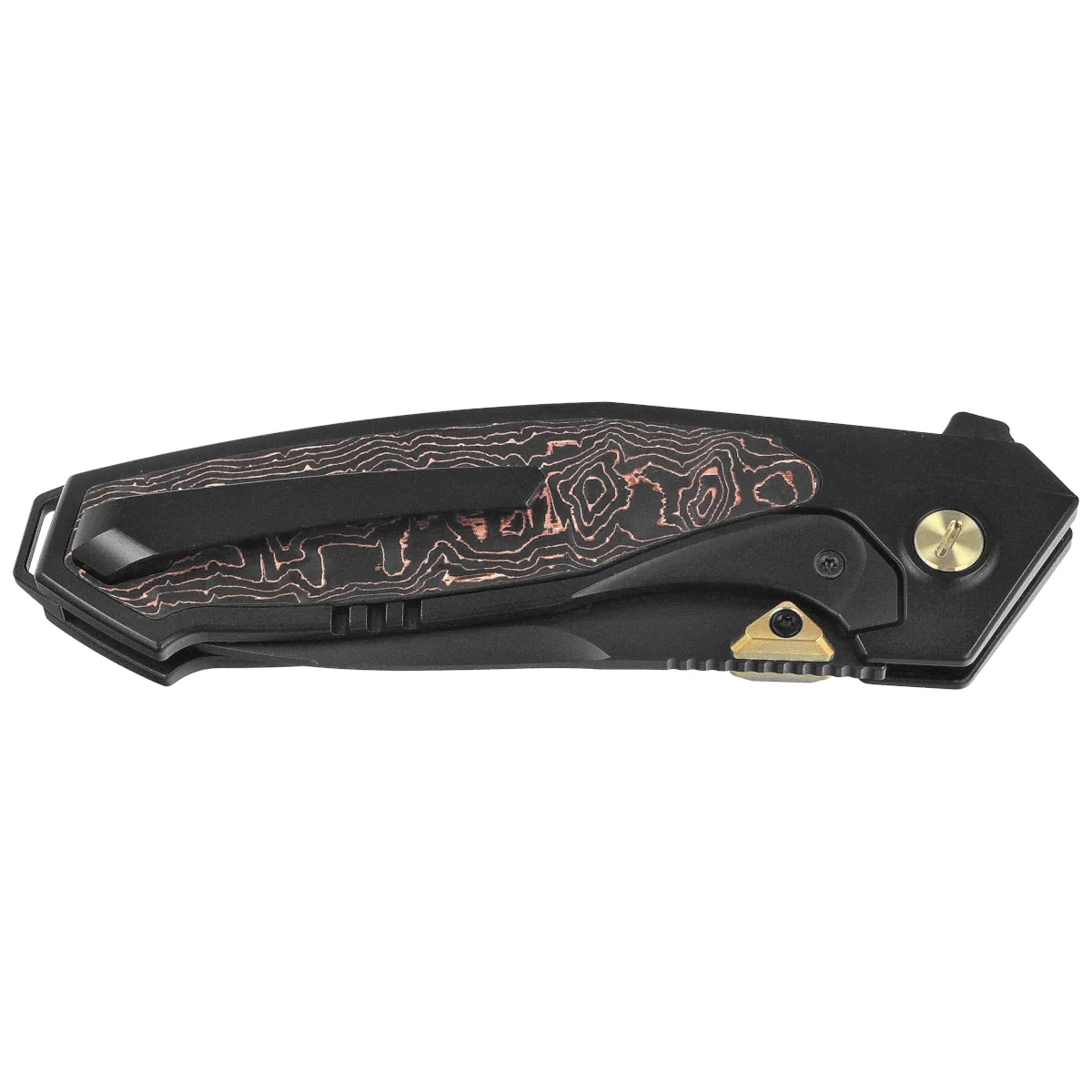 Handle - made of milled titanium 6AL4V, provides a solid base for a slim and durable design. Copper Carbon Fiber composite inserts improve the grip and emphasize the modern character of the design. The Handle has been contoured to provide comfort and control even during prolonged use - the ergonomic ribbing naturally fits the hand. The whole is complemented by an integrated backspacer which, when removed, can be used to unscrew the pivot screw, and a deep carry clip, which allows low-profile and secure carry. Handle design is a thoughtful balance between aesthetics and practicality, meeting the needs of experienced EDC users.
