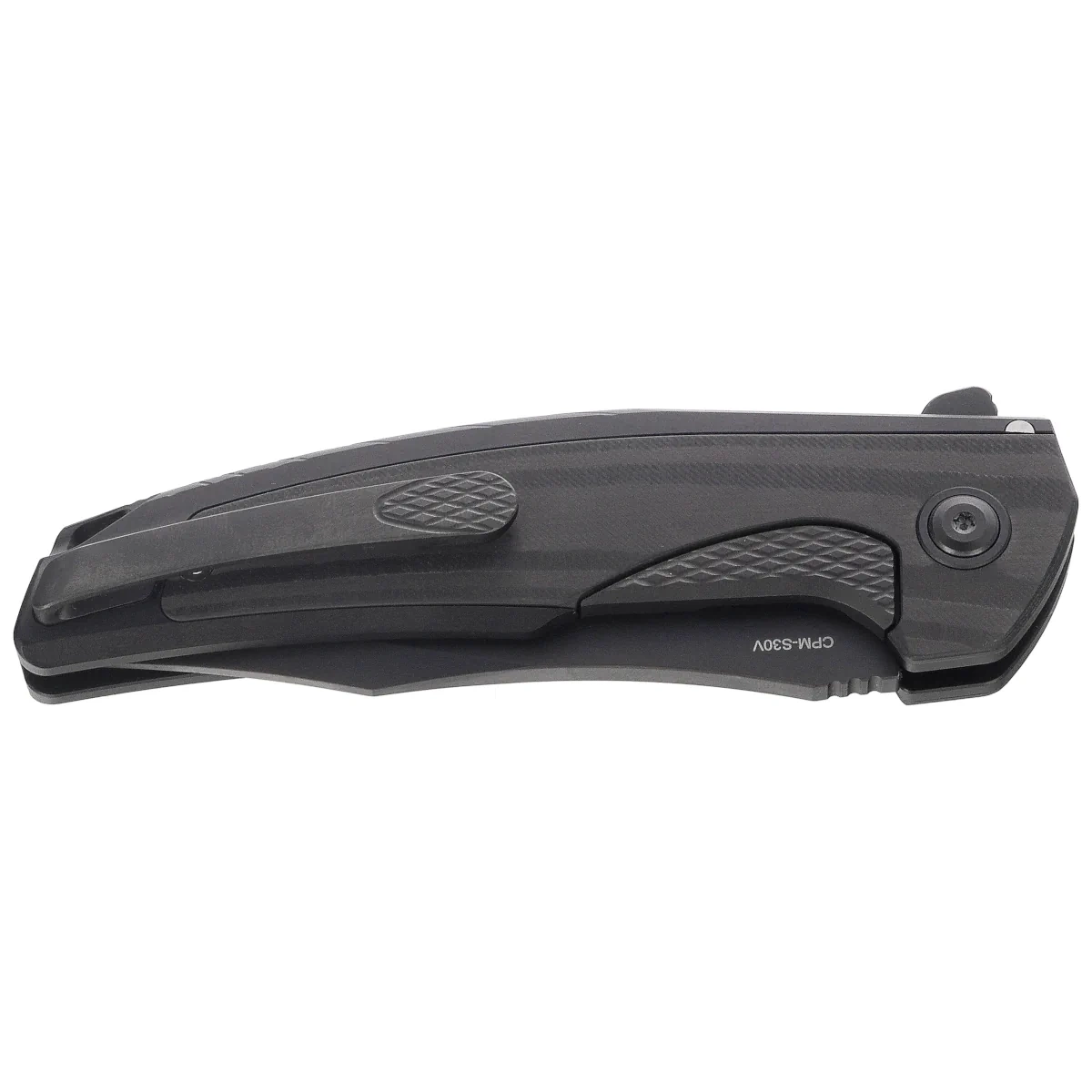 Blade - with a clip point profile allows precise maneuvering and penetration of the material, maintaining full edge control. The blade is made of CPM S30V steel for excellent sharpness retention and high wear resistance. The flat grind supports the cutting properties of the blade, while the DLC coating adds a tactical touch and minimizes the visibility of minor scratches. Ball bearing flipper mechanism allows for quick one-handed opening, and notching on the back increases grip stability.