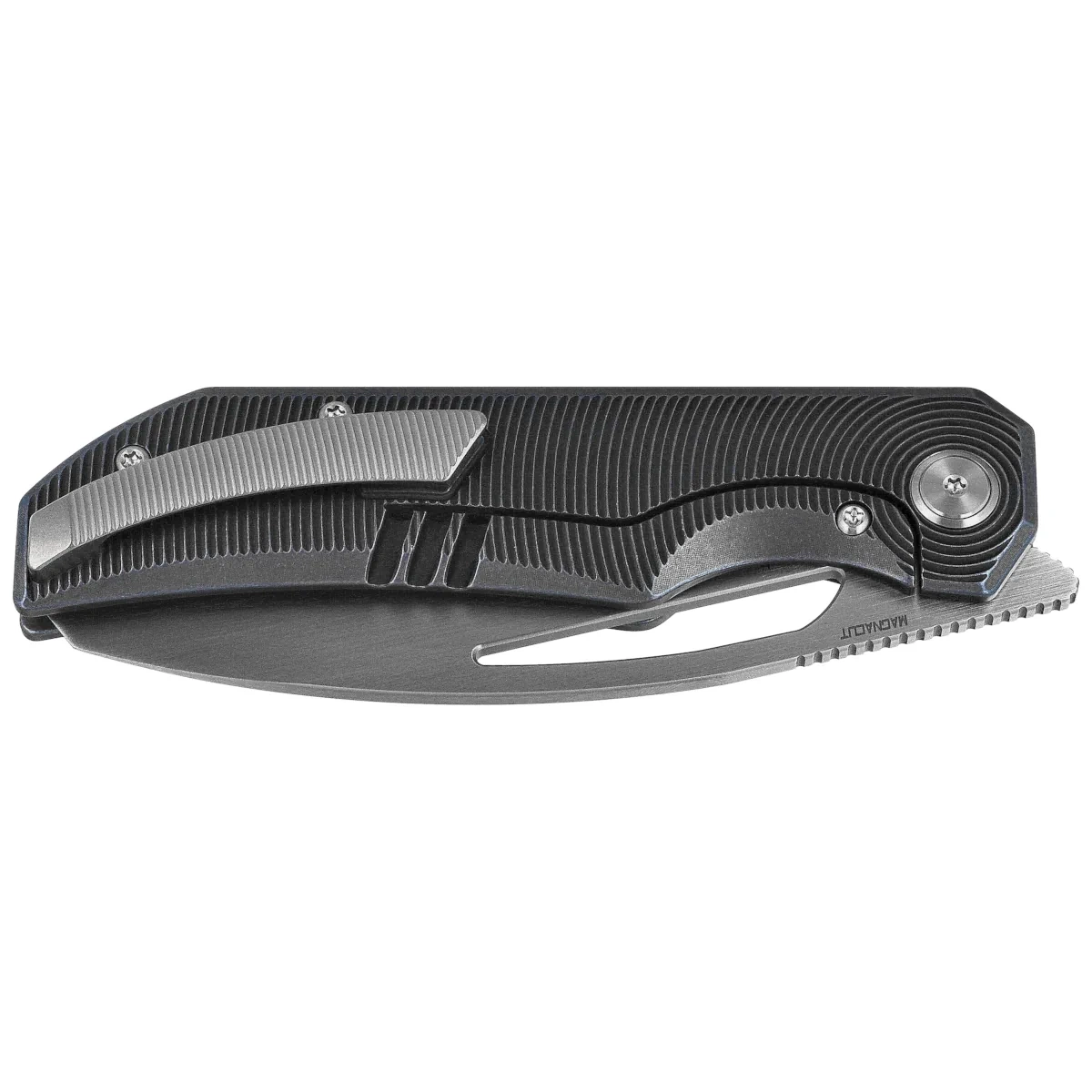 Handle - made of milled titanium form a consistent, rigid construction with a distinctly technical character. Dense, rhythmic milling not only emphasizes the aesthetics of the design, but also improves the non-slip properties of the handle. The frame lock has been reinforced with a steel inlay, which ensures durability and reliable operation even under heavy use. The use of a deep carry clip made of titanium allows the knife to be carried comfortably and unobtrusively in the pocket. The carefully contoured shape of the Handle and the balance of the whole promote comfort - even with prolonged use.