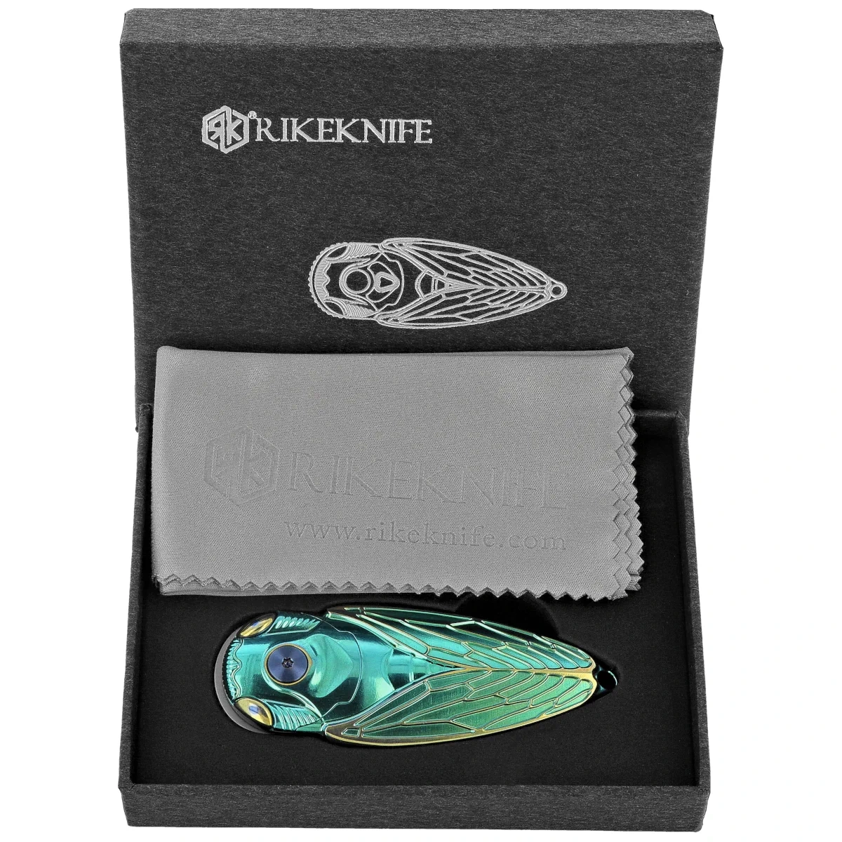 - Cicada-GG Green / Gold Titanium, Bead Blasted - a modern premium folding knife from Rike Knife, with an M390 steel blade and milled titanium handle. Biomechanical form, collectible character and technical precision in one design.