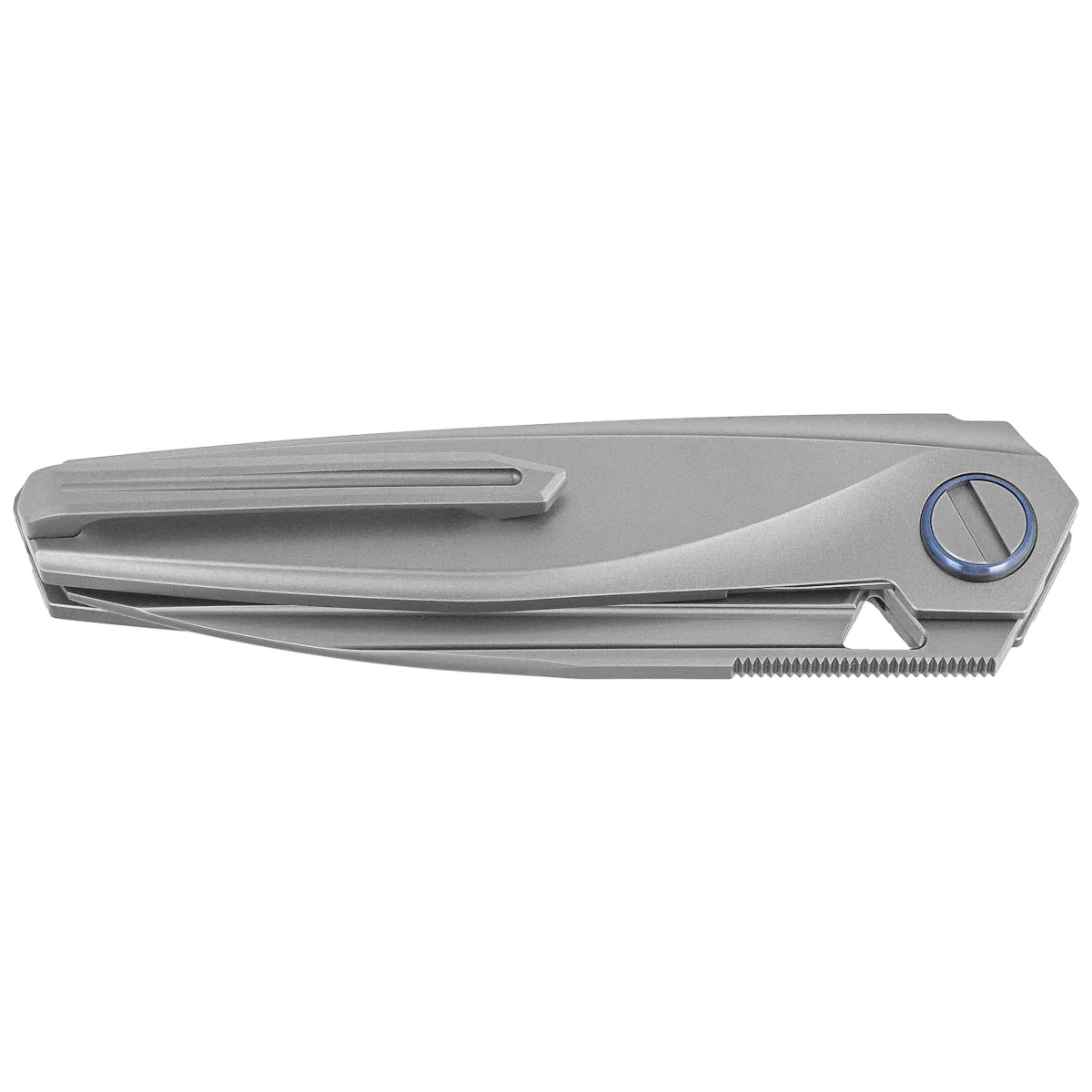 The Baidi S Titanium/Green Carbon Fiber, Bead Blasted from Rike Knife is a design created for users who want uncompromising precision and ergonomics tailored for everyday use. The centerpiece of the design is a 6AL4V titanium skeleton, providing excellent rigidity with minimal weight. An asymmetrical grips adorned with a Green Carbon Fiber inlay not only enriches the styling, but also strengthens the grip and reduces the weight of the design. Blade with Sheepsfoot profile is made of Böhler M390 powder steel, renowned for its exceptional edge durability and corrosion resistance. A full flat grind ensures smooth cutting and excellent penetration properties, while a bead blasted finish reduces reflections and increases resistance to micro-scratching - especially in field or workshop conditions. The opening mechanism is based on a front flipper and ball bearings, which ensures immediate blade response and smooth, play-free operation. A liner lock with easy access is responsible for locking. The deep carry clip allows the knife to be carried discreetly in the pocket, without affecting ergonomics. Baidi S is a model for people who expect durability, functionality and the highest work culture from a tool.