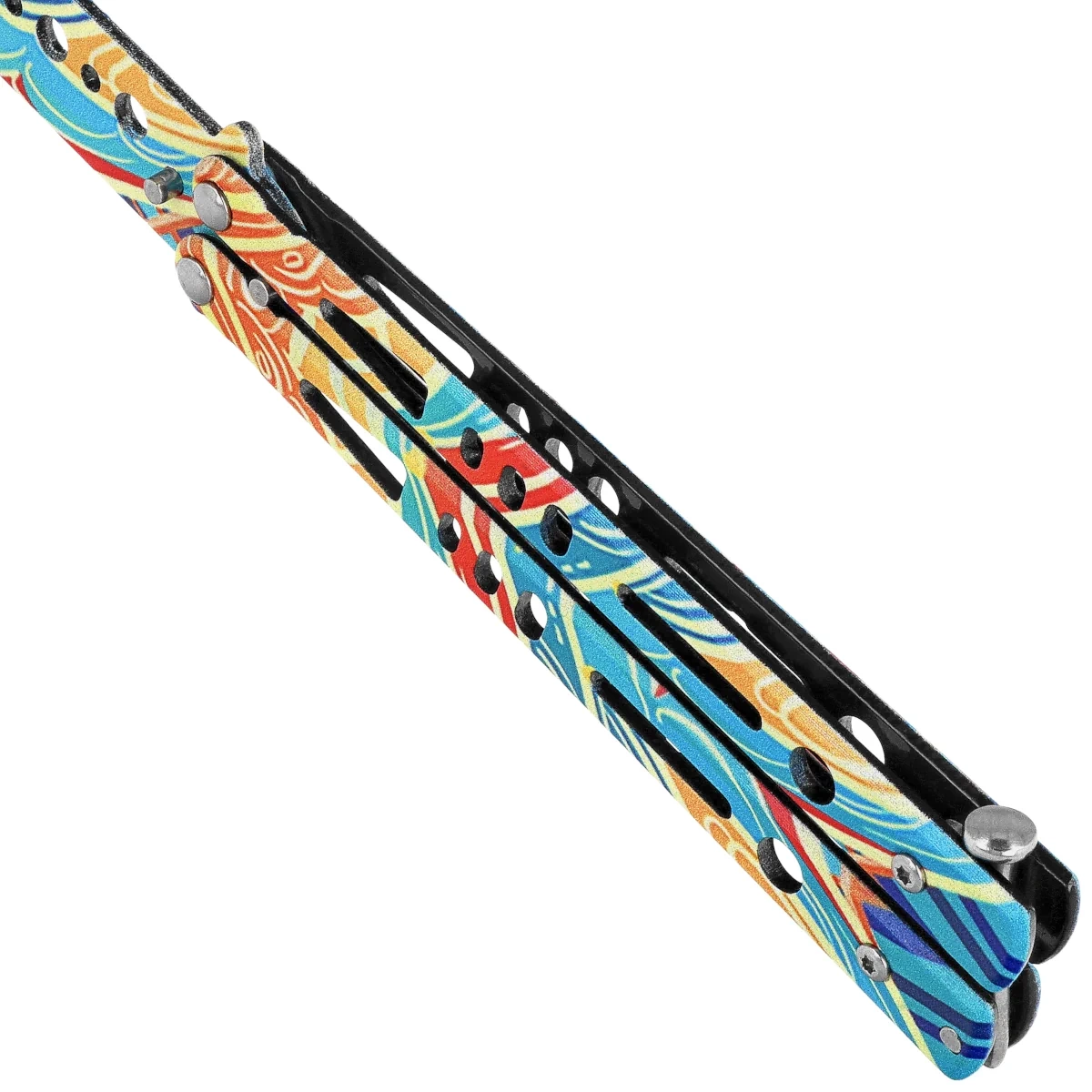 • Balisong Training 3D Design Steel, 3D Design 3Cr13Mov (02270) - a striking butterfly training knife with a trainer type blade and a steel handle with a colorful design. A safe tool for learning and perfecting balisong tricks.