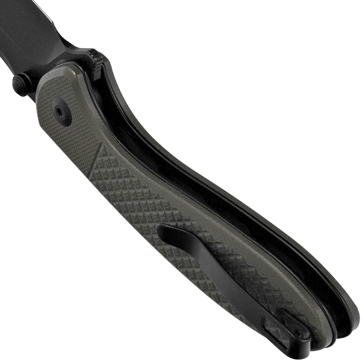 Handle - made of G10, a durable, moisture-proof and damage-resistant composite. Cross-milling of the surface improves grip and increases control during dynamic movements. Ergonomic profile with gentle finger undercuts allows comfortable handling of the knife even during prolonged use. Inside there are steel liners, which strengthen the entire construction. The whole is complemented by a deep-carry clip with the possibility of flipping it to the other side, which makes the model fully suitable for right- and left-handed users.