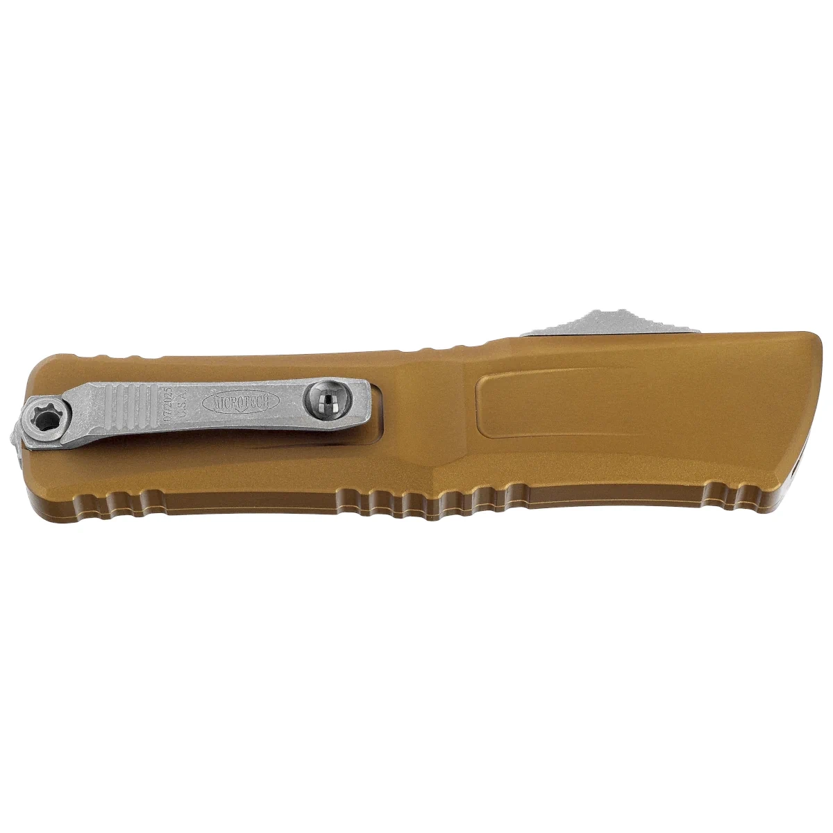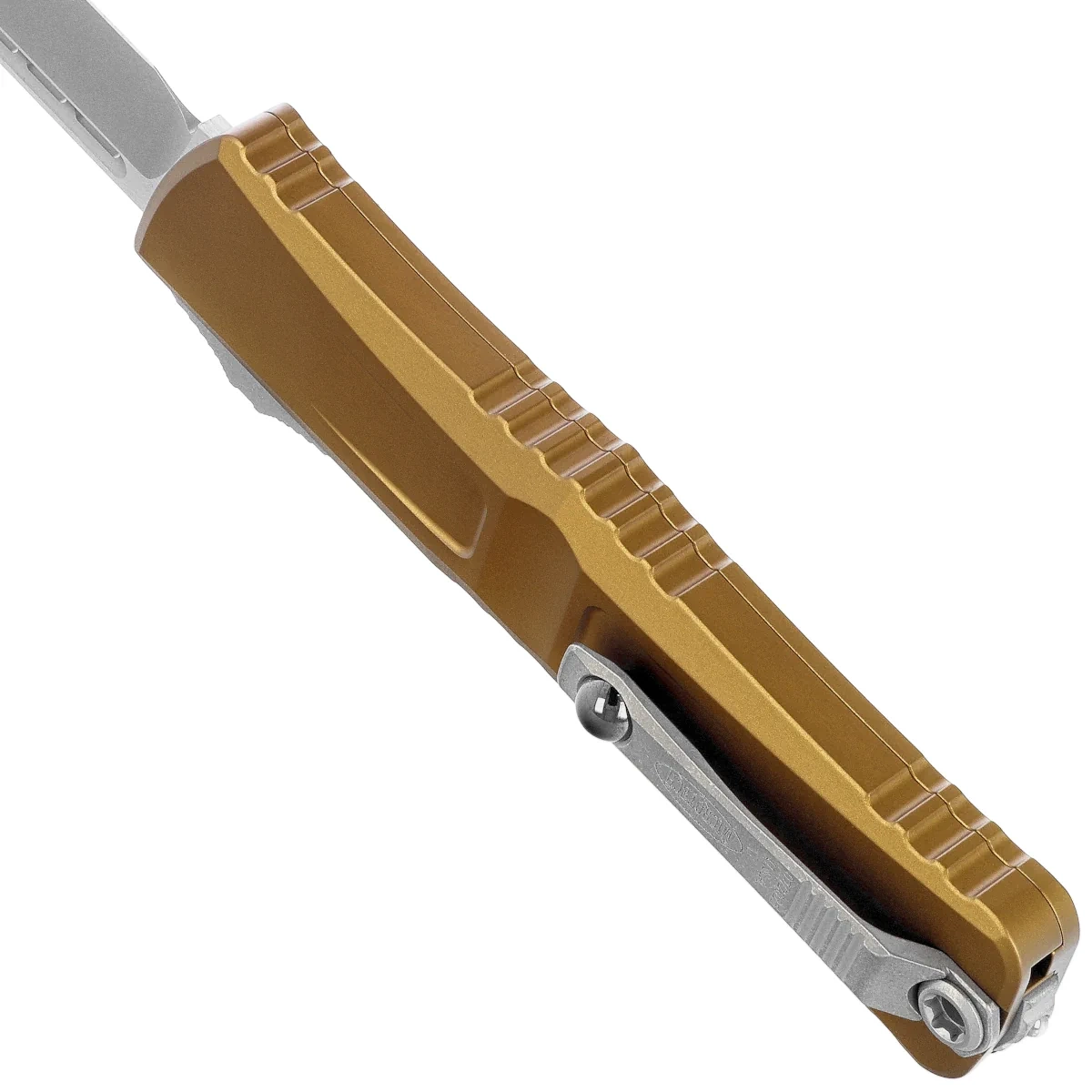 Handle - made with excellent precision in 3D technology on CNC milling machines, from Mil-Spec coated aluminum 6061-T6. The surface texture of the Handle and the deep notches (jimping) on it make the knife non-slip in the hand during use. The slim profile and milled two-position (right/left) solid deep-carry clip allow the knife to be carried discreetly in the pocket, in tip-down (blade tip down) position. Equipped with a smooth rollerball, which allows the knife to slide easily into the pocket without damaging the pocket edges. The clip bears the Microtech logo and production date. The Handle is finished with glass breaker, a steel triangle, into which a tungsten carbide ball has been pressed.
