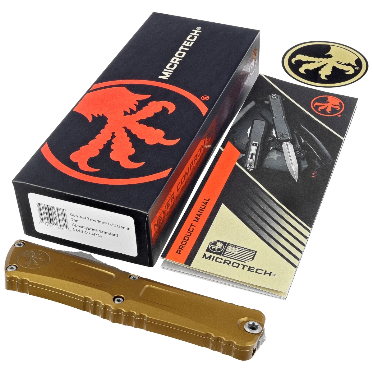 Combat Troodon Gen III S/E Tan Aluminum, Apocalyptic this largest of the automatic knives is the pinnacle of precision engineering and tactical prowess in the field of OTF (Out The Front) knives. Built for a wide range of utility applications, it boasts a 25% larger size compared to the flagship Troodon. Precisely crafted, it features a sophisticated and hellishly fast mechanism that extends the razor-sharp blade. 100% made and assembled in the USA. Designed by Anthony Marfione, knifemaker and owner of Microtech Knives.