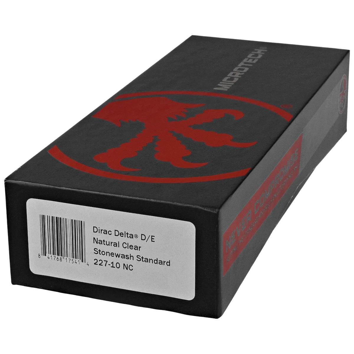 Dirac Delta D/E Natural Clear Aluminum, Stonewashed is an enlarged OTF automatic knife from the Dirac series. Operating in D/A mode, it features a hellishly fast blade extension mechanism. Slider button on the side of the handle. 100% made and assembled in the USA. Designed by Anthony Marfione, knifemaker and owner of Microtech Knives.