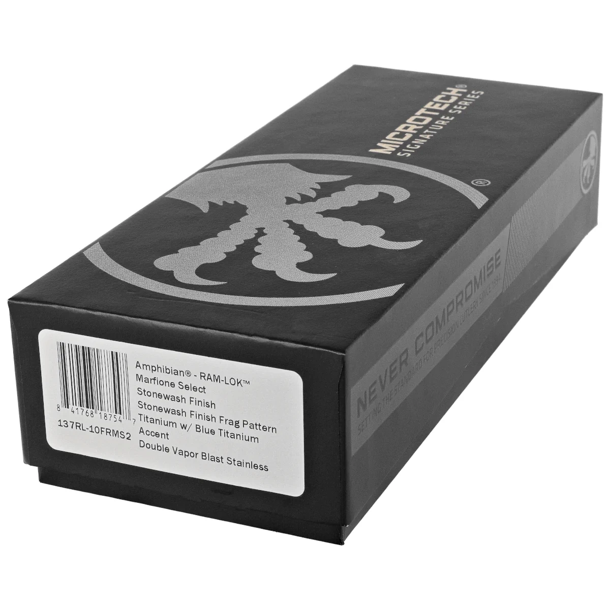 Marfione Select Amphibian Ram-Lok S/E Stonewashed Frag Pattern Titanium, Stonewashed reissue of the iconic Amphibian model, combining strength, durability and elegance. Its blade is made of excellent M390MK steel , which is the result of a collaboration between two renowned companies - Microtech and Böhler. This steel is known for its exceptional strength and long sharpness retention, making this knife unafraid of any challenge. The intuitive RAM-Lock lock ensures safety during use. This innovative lock is easy to operate and provides ease of use for both right and left-handed people. Handle of the knife made of titanium, durable and ergonomic. Its shape is designed to fit perfectly in the hand, ensuring comfort even during prolonged use. This knife is not only a tool, but also a work of applied art. Its designer, Anthony Marfione, founder and owner of Microtech, has taken care of every detail. This knife is both beautiful and practical. Whether you are looking for a reliable tool or an elegant accessory, this knife will meet your expectations.
