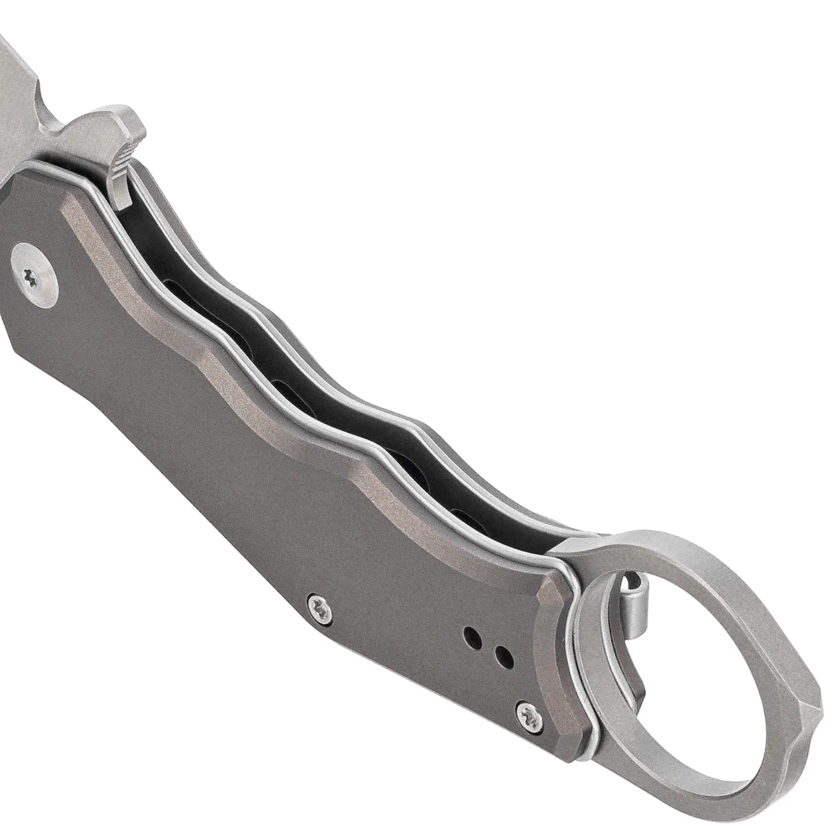Handle - aluminum construction combines low weight with high mechanical resistance, providing solid support for the hand. Profiled finger grooves and an integrated grip ring increase the stability of the handle, allowing smooth maneuvers and rotational techniques typical of karambits. The button lock mechanism used guarantees reliable locking of the blade, while not hindering its release. The deep carry clip ensures discreet carrying, and the technical form of the handle emphasizes the modern, utilitarian style of the knife. Amaroq is a tool where function meets design precision.