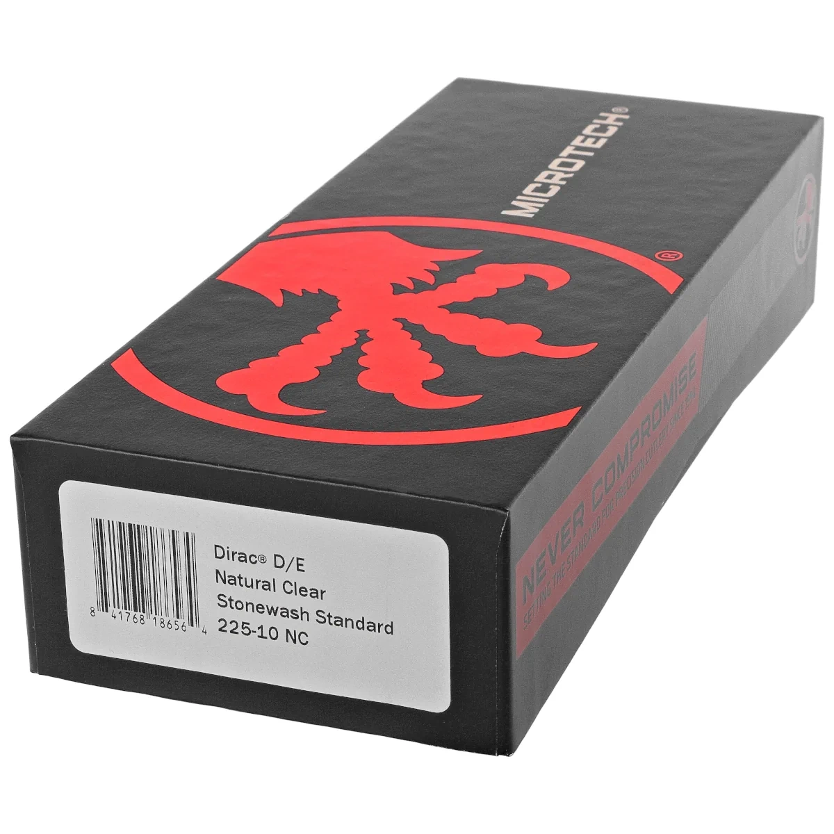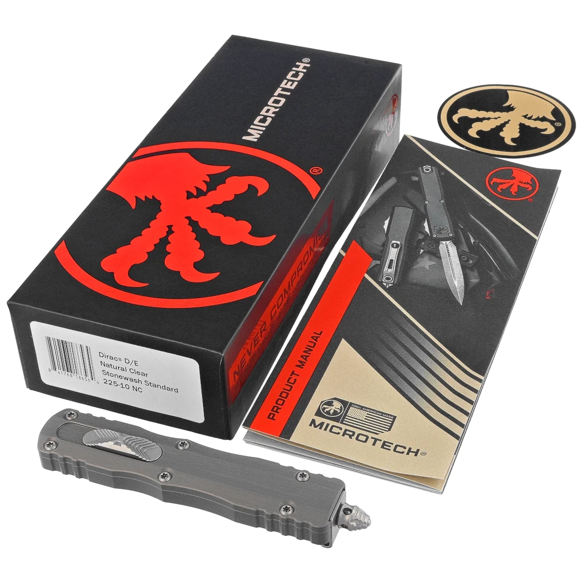 Dirac D/E Natural Clear Aluminum, Stonewashed is a compact OTF automatic knife from the Dirac series. Operating in D/A mode, it features a hell of a fast blade extension mechanism. Slider button on the side of the handle. 100% made and assembled in the USA. Designed by Anthony Marfione, knifemaker and owner of Microtech Knives.