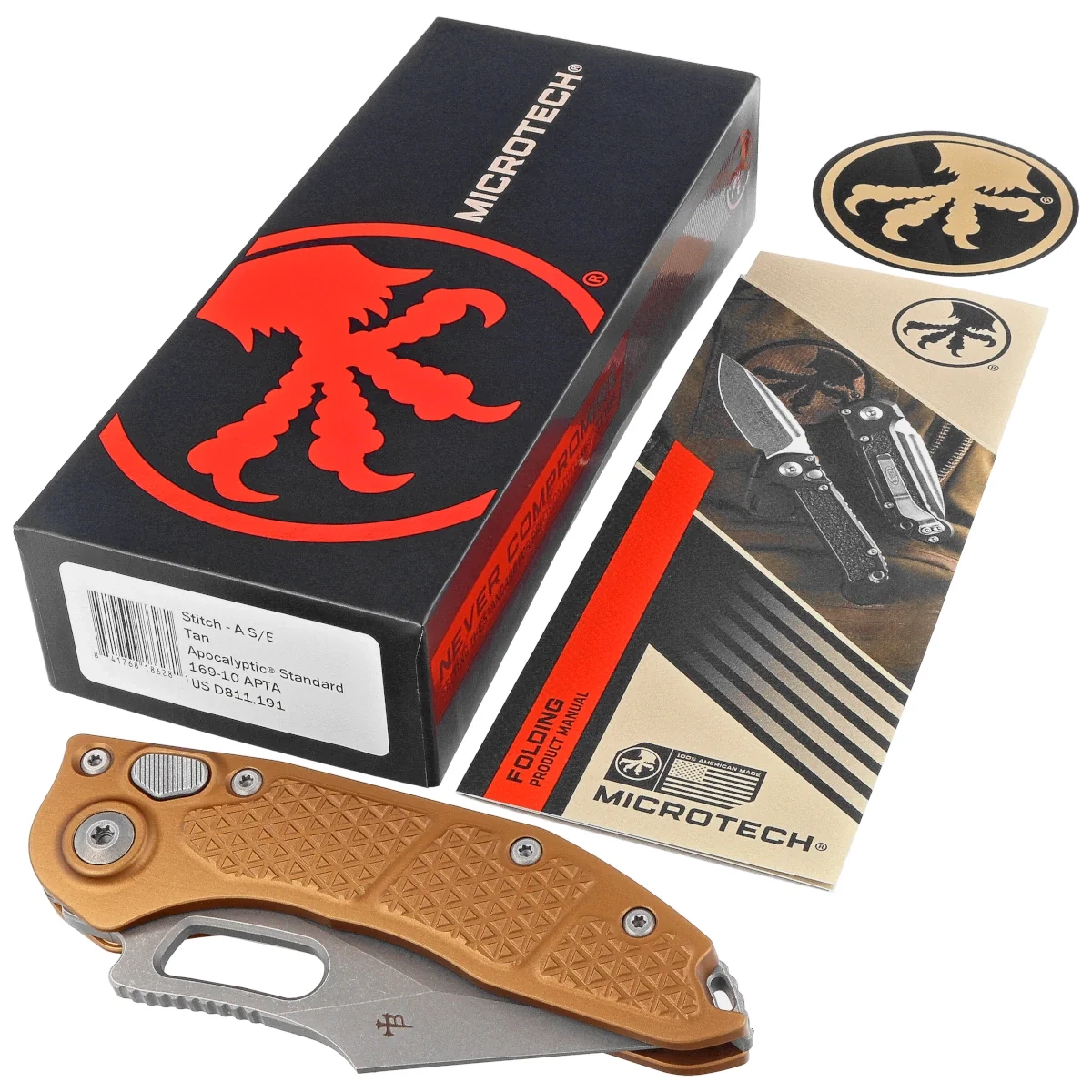 • Stitch-A S/E Tan Aluminum, Apocalyptic automatic version of the popular design by Sebastijan Berenjie of Borka Blades and Microtech. Wide harpoon-shaped blade, superior materials and legendary Microtech workmanship!