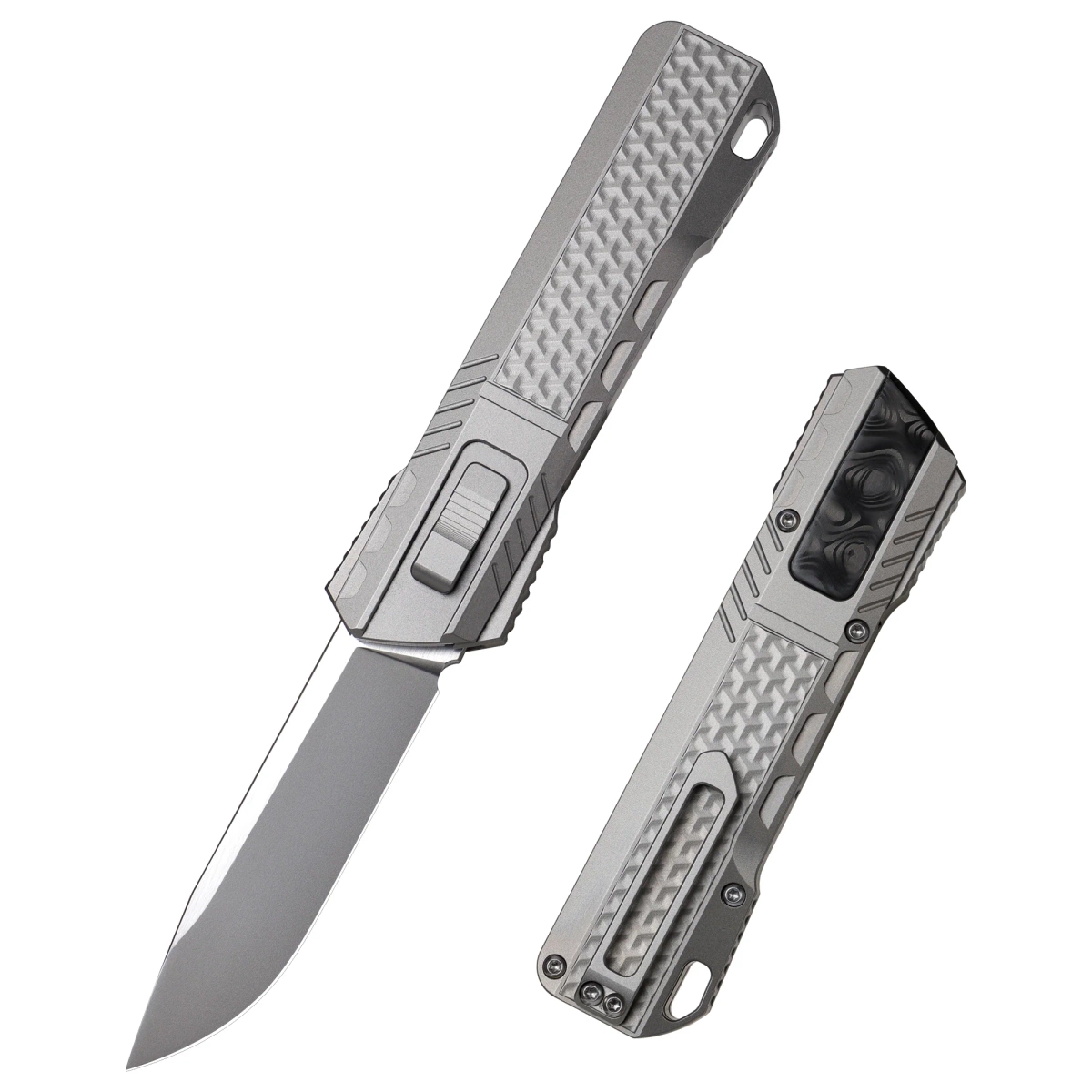 Handle - made on CNC milling machines from titanium, with three-dimensional texture. Chamfered edges of the covers eliminate sharp edges and improve grip security. Carbon Fiber composite inlay gives visual contrast and improves grip. On the right side, an artful slide for advancing/retracting the blade. A single-position titanium (right) deep-carry clip allows the knife to be carried discreetly in a pocket in tip-down (blade tip down) position.