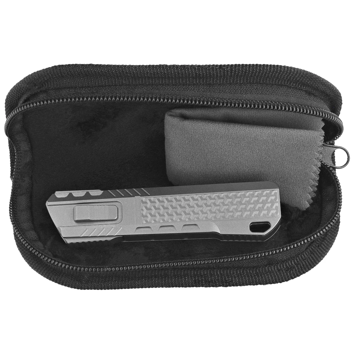 Handle - made on CNC milling machines from titanium, with three-dimensional texture. Chamfered edges of the covers eliminate sharp edges and improve grip security. Carbon Fiber composite inlay gives visual contrast and improves grip. On the right side, an artful slide for advancing/retracting the blade. A single-position titanium (right) deep-carry clip allows the knife to be carried discreetly in a pocket in tip-down (blade tip down) position.