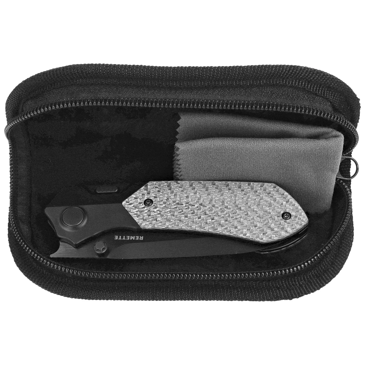 Handle - made of titanium, designed for maximum durability and purity of technical form. Stable construction eliminates weakening points, and carbon fiber inlays perform both aesthetic and ergonomic functions , improving grip and reducing weight. The contoured edges and carefully refined proportions of the handle promote operational stability and comfort for long-term use. The attachment clip allows convenient and discreet carrying, without disturbing the lines of the design. Handle design captures the spirit of technological aesthetics, which is part of the Remette brand DNA.