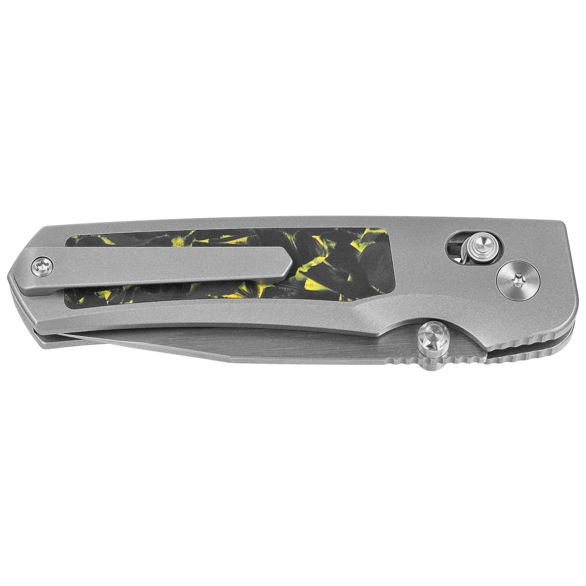 Handle - 6AL4V titanium skeleton, the surface of which has been treated with ceramic sandblasting, providing a matte finish resistant to traces of use. Carbon fiber inserts , embedded precisely in the recesses, increase grip and add visual contrast. The axis lock works with ceramic bearings, which translates into velvety smoothness of folding and unfolding the blade. The design is crowned by a double-sided deep carry clip made of titanium, allowing the folder to be carried discreetly. The ergonomic shape, symmetrical layout and high quality finish make the Aurora model an excellent everyday tool.