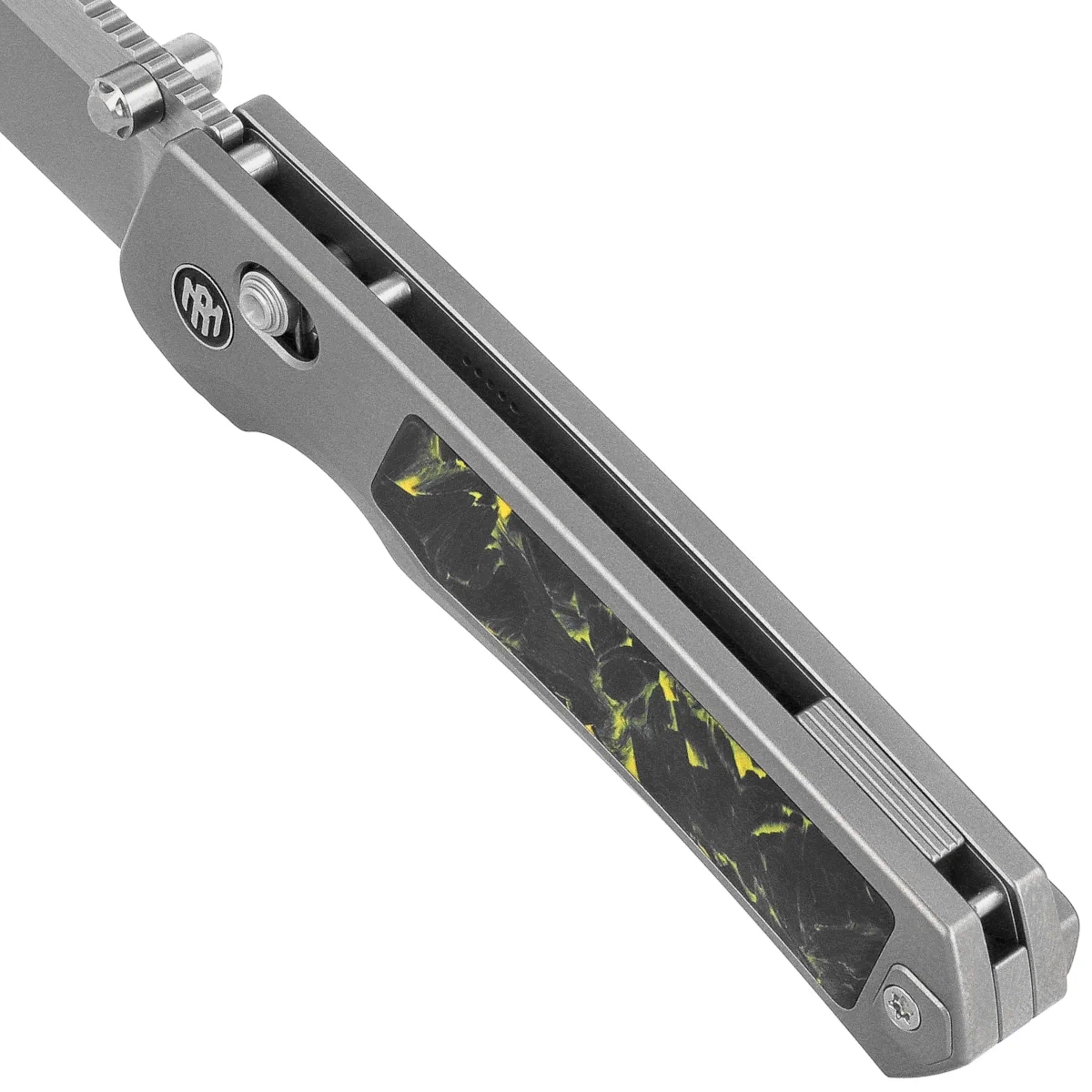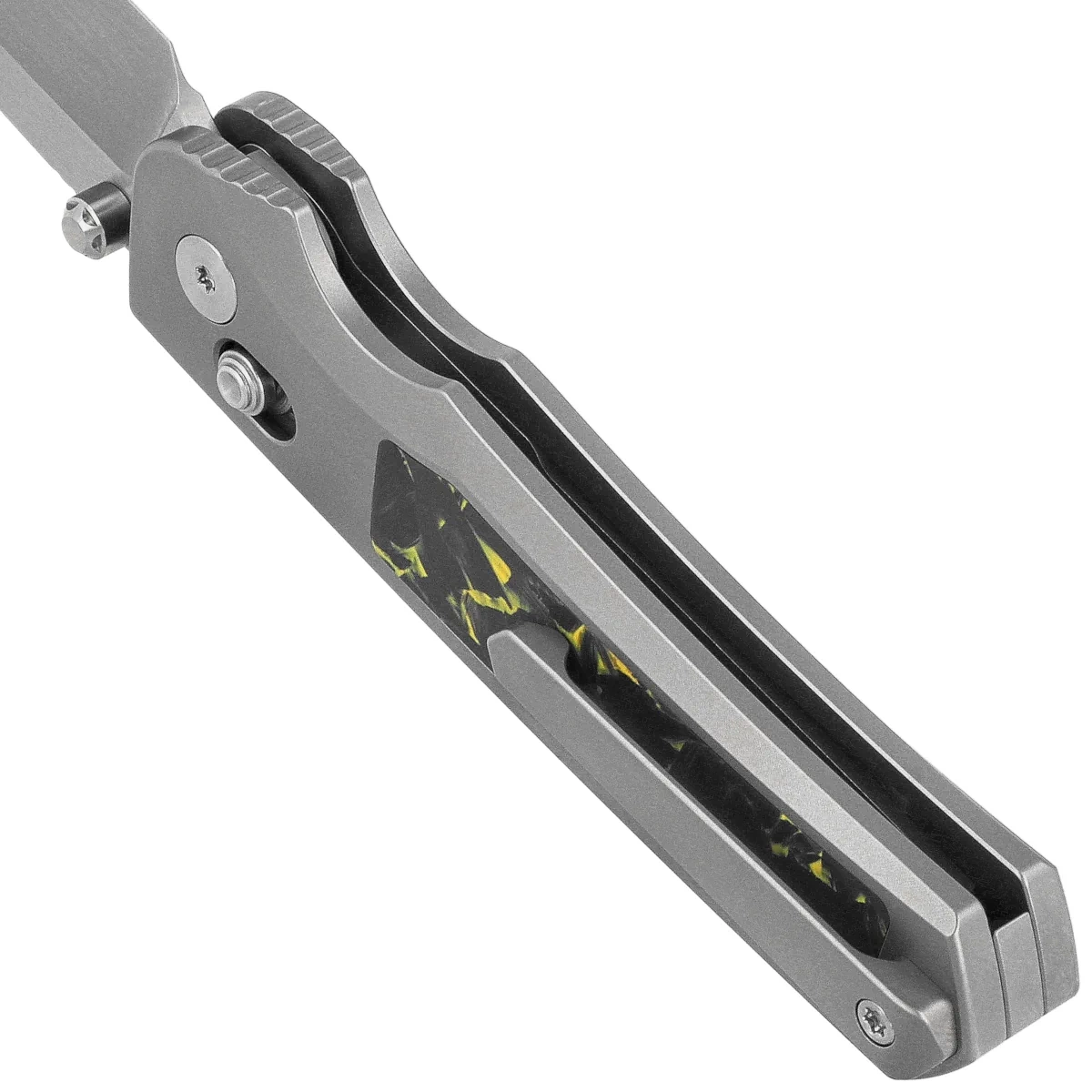 - Aurora Gray Titanium/Carbon Fiber, Manual Fine Grinding Satin/Pearlescent, elegant folding knife with titanium Handle and carbon fiber inlays. Blade made of M390 steel finished by hand, axis lock, ceramic bearings.