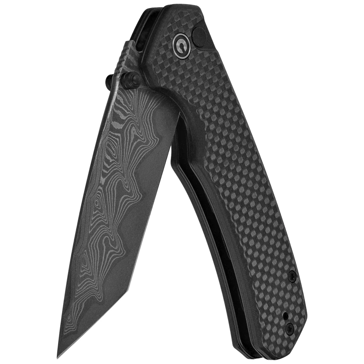 Brazen Button Lock Twill Carbon Fiber Overlay on Black G10, Damascus new version of the popular tanto blade folding knife from Civivi. The main change is an intuitive button lock and superior Damascus steel. A double-sided Thumb Stud, a quick flipper (index-finger flipper) and a blade with a shifted center of gravity (gravity opening) allow the blade to be opened in three ways. Made of good materials at an attractive price. Bestseller!