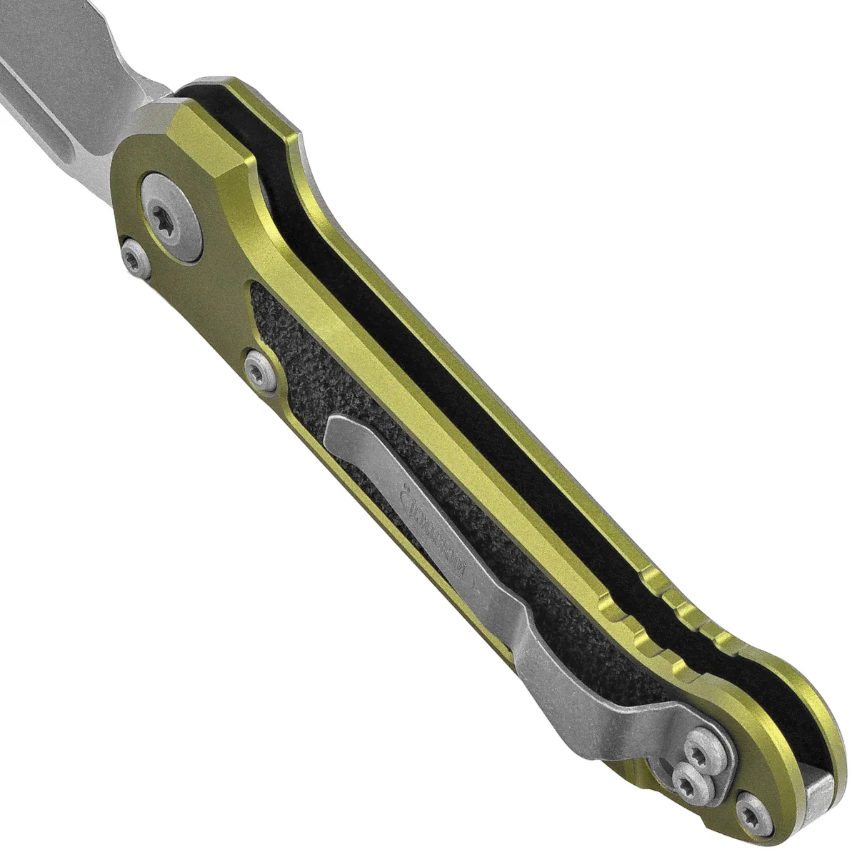 Head - machine ground S/E (Single Edge) Drop Point, single sided sharpened with a long line of armor grooves on both sides of the blade for reinforcement. Features a matte Apocalyptic finish that creates a distinctive aged and battle-worn look. The expansive belly extends the length of the cutting edge relative to the length of the blade converging toward the needle-sharp tip. The solid thickness of the blade and the long bevel combined with the high flat grind (Flat Grind) gives excellent cutting properties combined with high durability. Ceramic ball bearings assist in opening the blade with a push button, for safety located in a slight recess. To maintain full control of the blade, there is an upper jimping, notched thumb rest on the back of the wedge. The whole thing is locked with the proven and popular button lock.