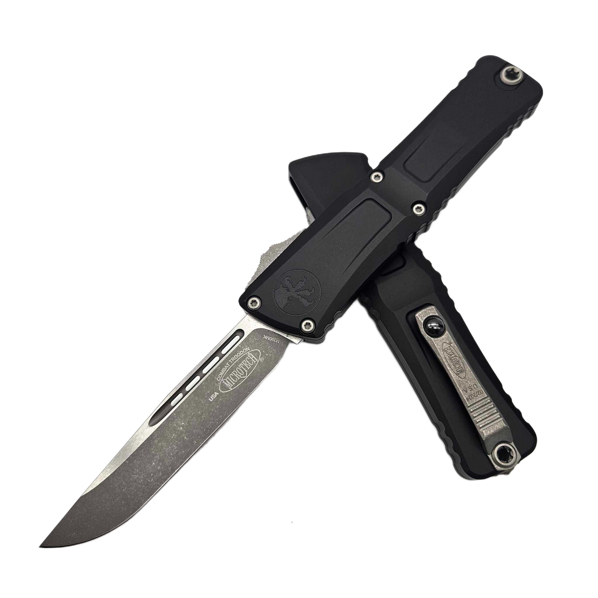 Combat Troodon OTF Line - Troodon means “wounding tooth” in Greek. Although the name was first given to a Raptor-like dinosaur, the name is equally appropriate for Microtech's large OTF knife, designed for all sorts of uses and close combat. The over-the-top,Double Action (D/A) automatic knife is a favorite OTF among law enforcement officers, the U.S. armed forces and emergency services personnel. Its rugged construction makes the Combat Troodon® suitable for heavy use, and the advantages of the Out The Front automatic also make it an excellent knife for everyday carry.