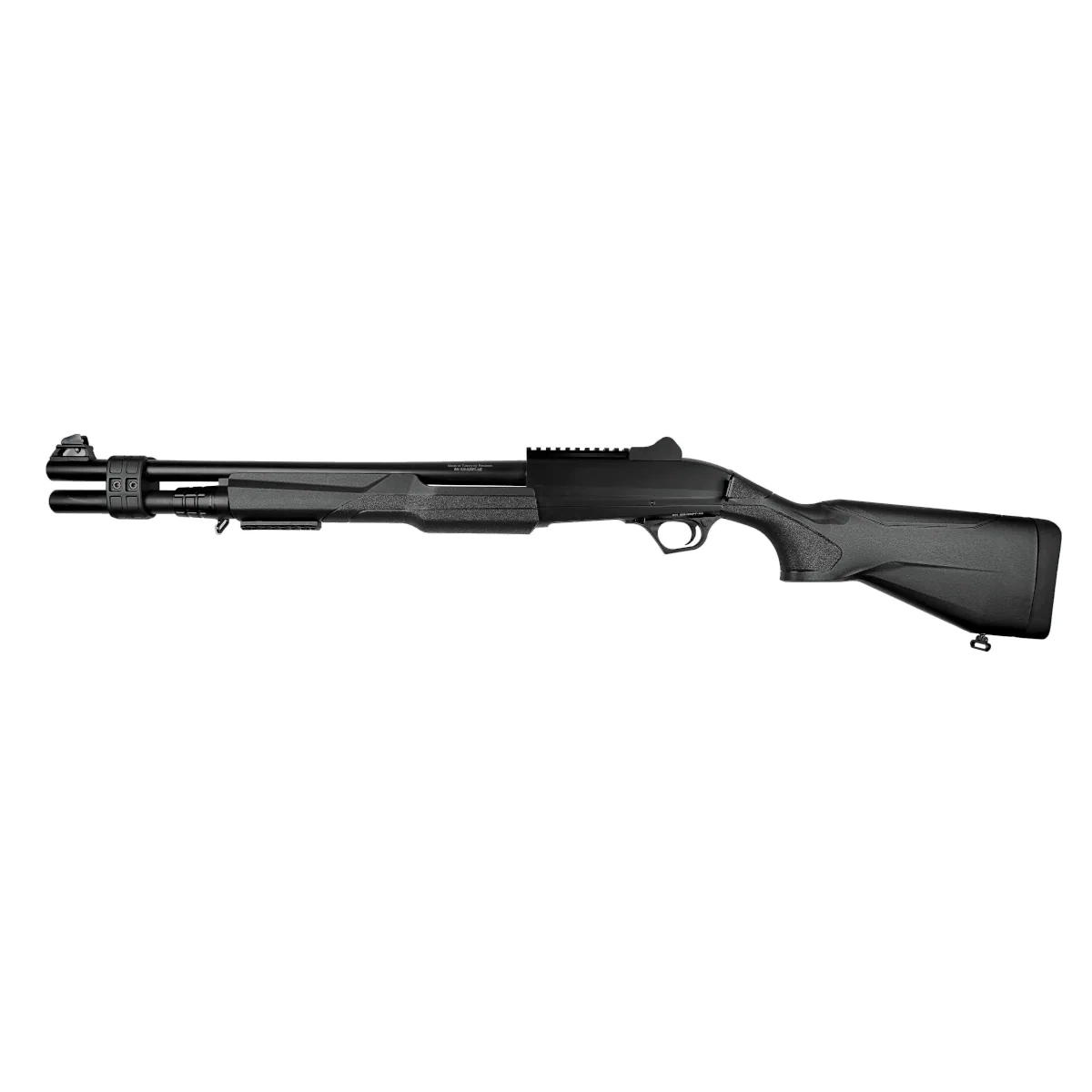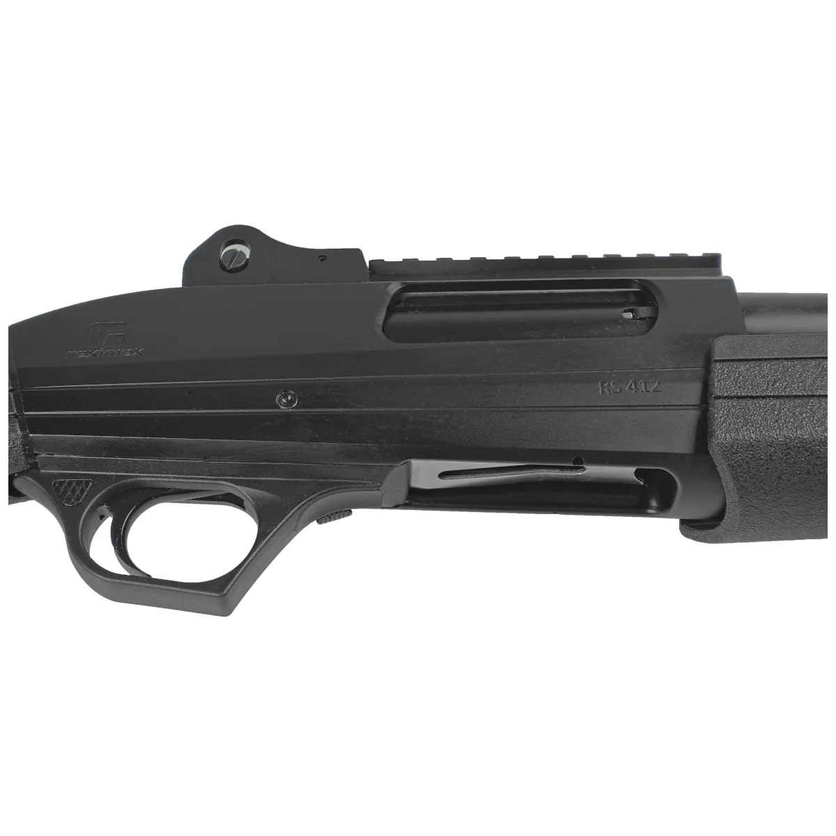- Reximex RS412 HD Black 20" 12/76 GA tactical pump-action shotgun in the Home Defence version, equipped with tactical fixed sights, two 22 mm Picatinny rails, and mounts for single- or two-point slings.
