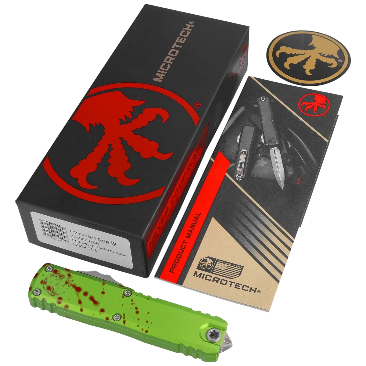 Microtech UTX-85 Gen IV D/E OTF Knife Zombie Aluminum, Stonewashed P/S M390MK by Tony Marfione (12324-11Z)