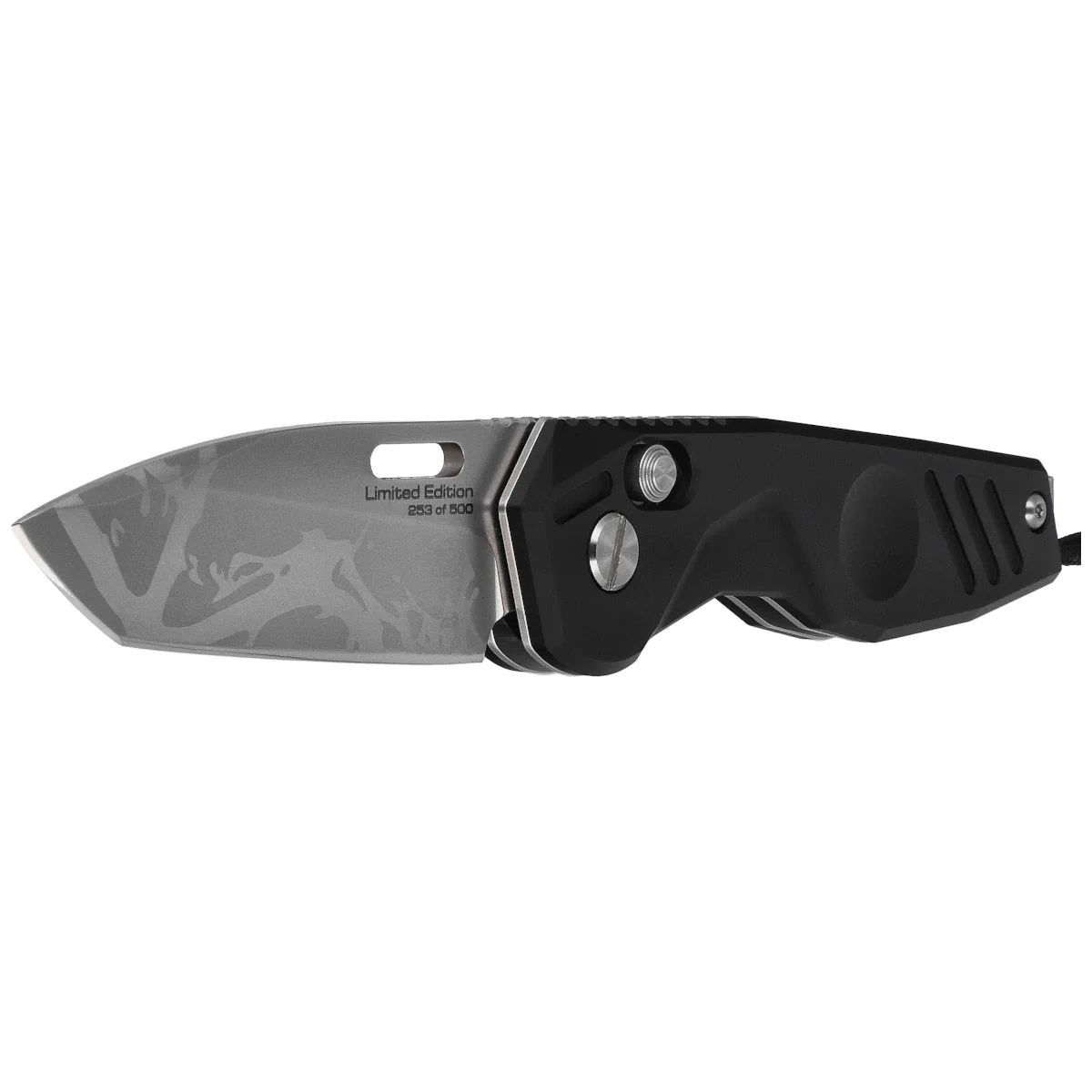 At the center of the set is the BFK EVO LE folder , produced in a quantity of only 500 pieces. The knife has an individual serial number (here: 253/500), and its design is based on the recognizable Basic Folder Knife line. Blade made of Nitrogen steel has been stonewashed finished with a laser camouflage pattern, giving each piece a unique look. The Axis Lock mechanism ensures reliable locking and smooth operation of the blade, while the anodized aluminum grips guarantee durability and comfort. The whole set is completed with a deep carry clip and a paracord with a metal tip.
