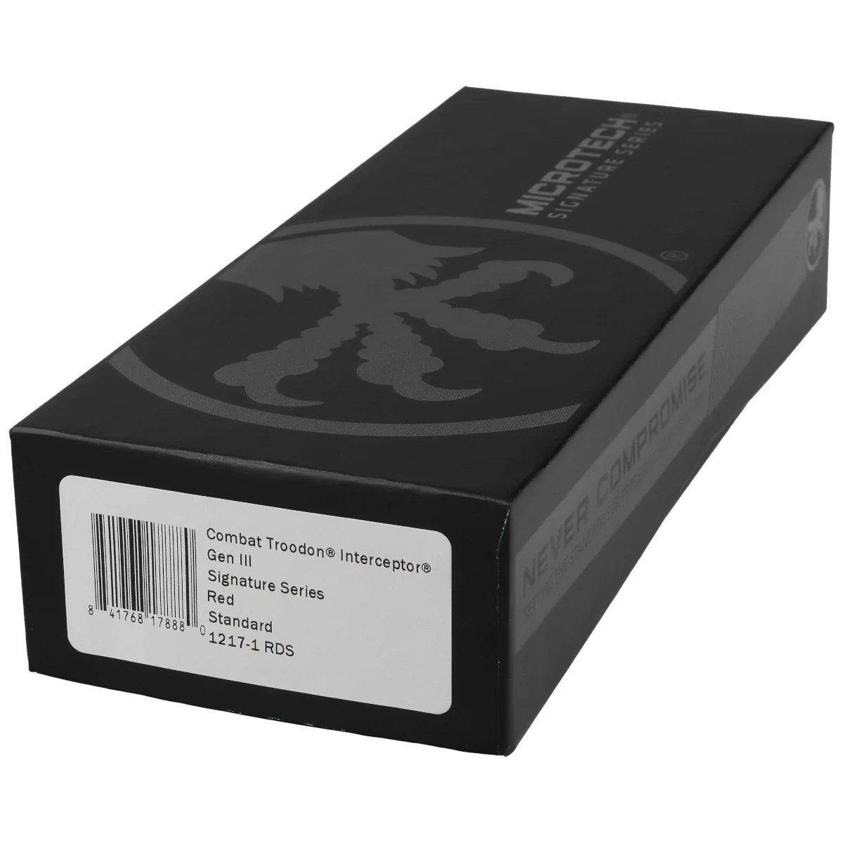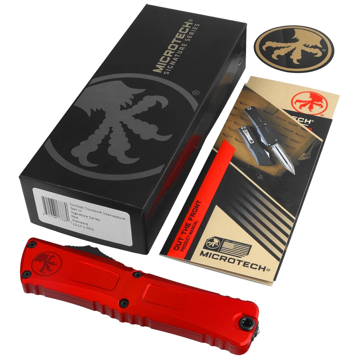 Combat Troodon Gen III Interceptor Signature Red Aluminum, Black this largest of the automatic knives is the pinnacle of precision engineering and tactical prowess in the field of OTF (Out The Front) knives. Built for a wide range of utility applications, it boasts a 25% larger size compared to the flagship Troodon. Precisely crafted with a sophisticated and hellishly fast ejection mechanism for the razor-sharp new type of blade - the Interceptor. 100% made and assembled in the USA. Designed by Anthony Marfione, knifemaker and owner of Microtech Knives.