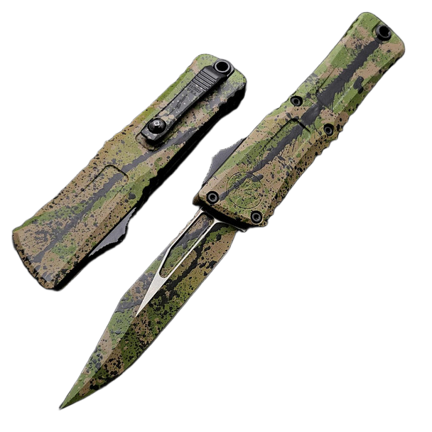 Combat Troodon Gen III Bowie Signature OD Green/Tan W/Black Splatter Aluminum, OD Green/Tan W/Black Splatter this largest of the automatic knives, is the pinnacle of precision engineering and tactical prowess in the field of OTF (Out The Front) knives. Built for a wide range of utility applications, it boasts a 25% larger size compared to the flagship Troodon. Precisely crafted, it features a sophisticated and hellishly fast mechanism that extends the razor-sharp blade. 100% made and assembled in the USA. Designed by Anthony Marfione, knifemaker and owner of Microtech Knives.