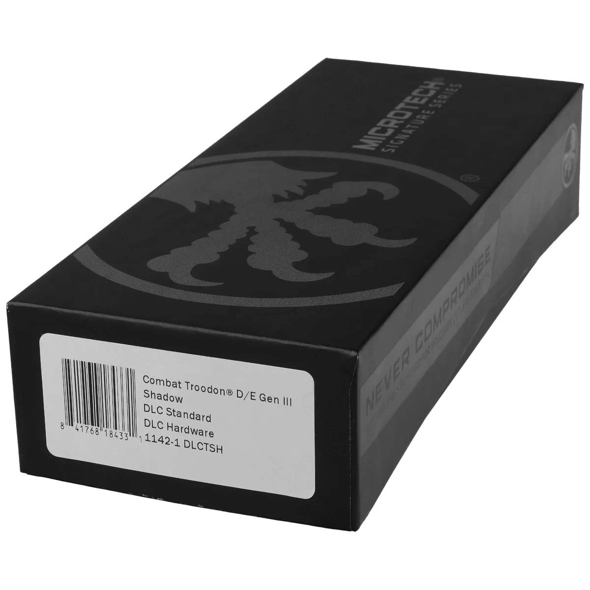 Combat Troodon Gen III D/E Shadow DLC Aluminum, Shadow DLC this largest of the automatic knives is the pinnacle of precision engineering and tactical prowess in the field of OTF (Out The Front) knives. Built for a wide range of utility applications, it boasts a 25% larger size compared to the flagship Troodon. Precisely crafted, it features a sophisticated and hellishly fast mechanism that extends the razor-sharp blade. 100% made and assembled in the USA. Designed by Anthony Marfione, knifemaker and owner of Microtech Knives.