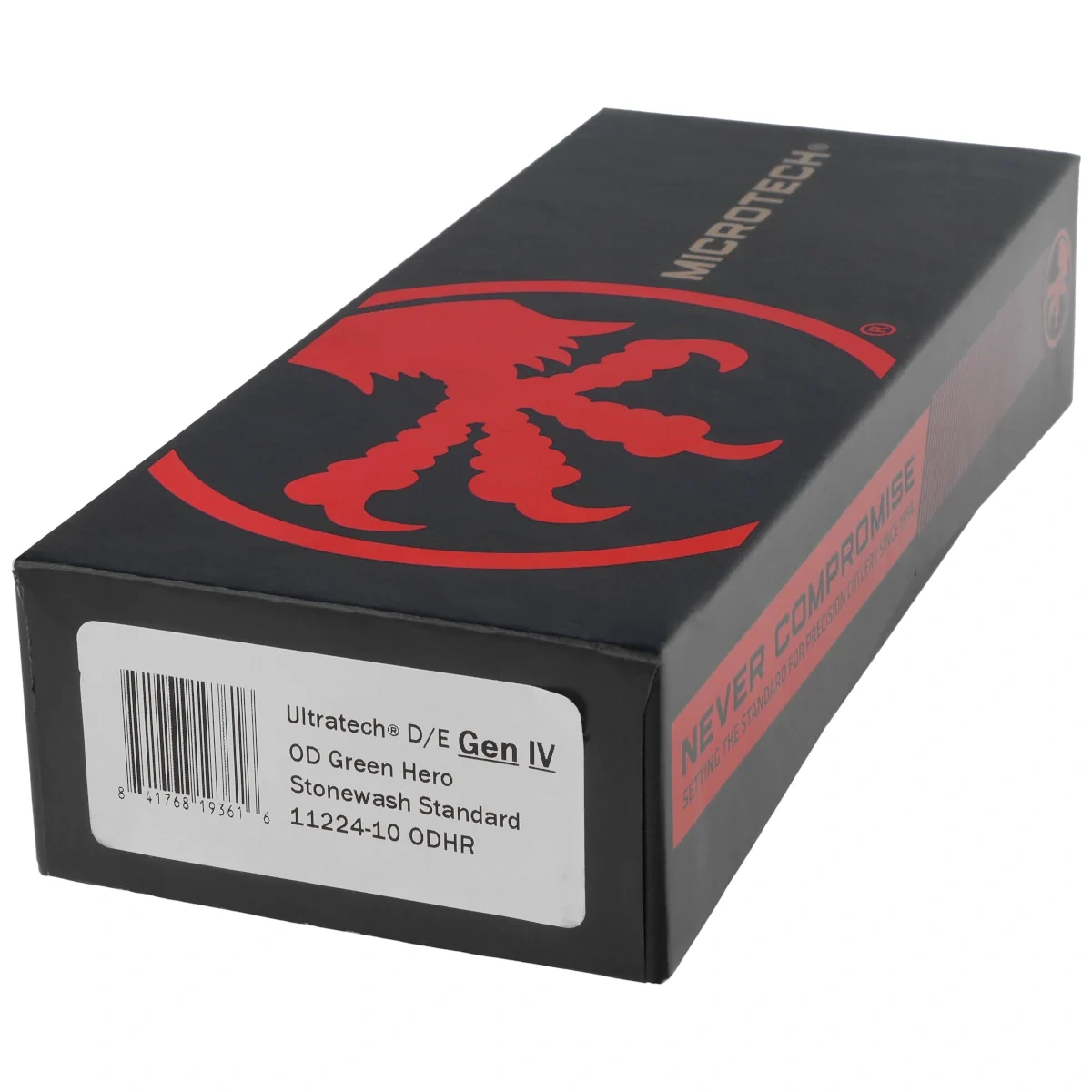 Ultratech Gen IV D/E Hero OD Green Aluminium, Stonewashed is a full-size OTF (Out The Front) automatic knife from the iconic Ultratech series, offered in an exclusive finish with Hero engraving. The contoured, green, anodized handle scales are made of aluminum and adorned with the Microtech Claw logo. The double-edged blade, finished in stonewashed, is covered with a distinctive, laser-applied pixel texture.