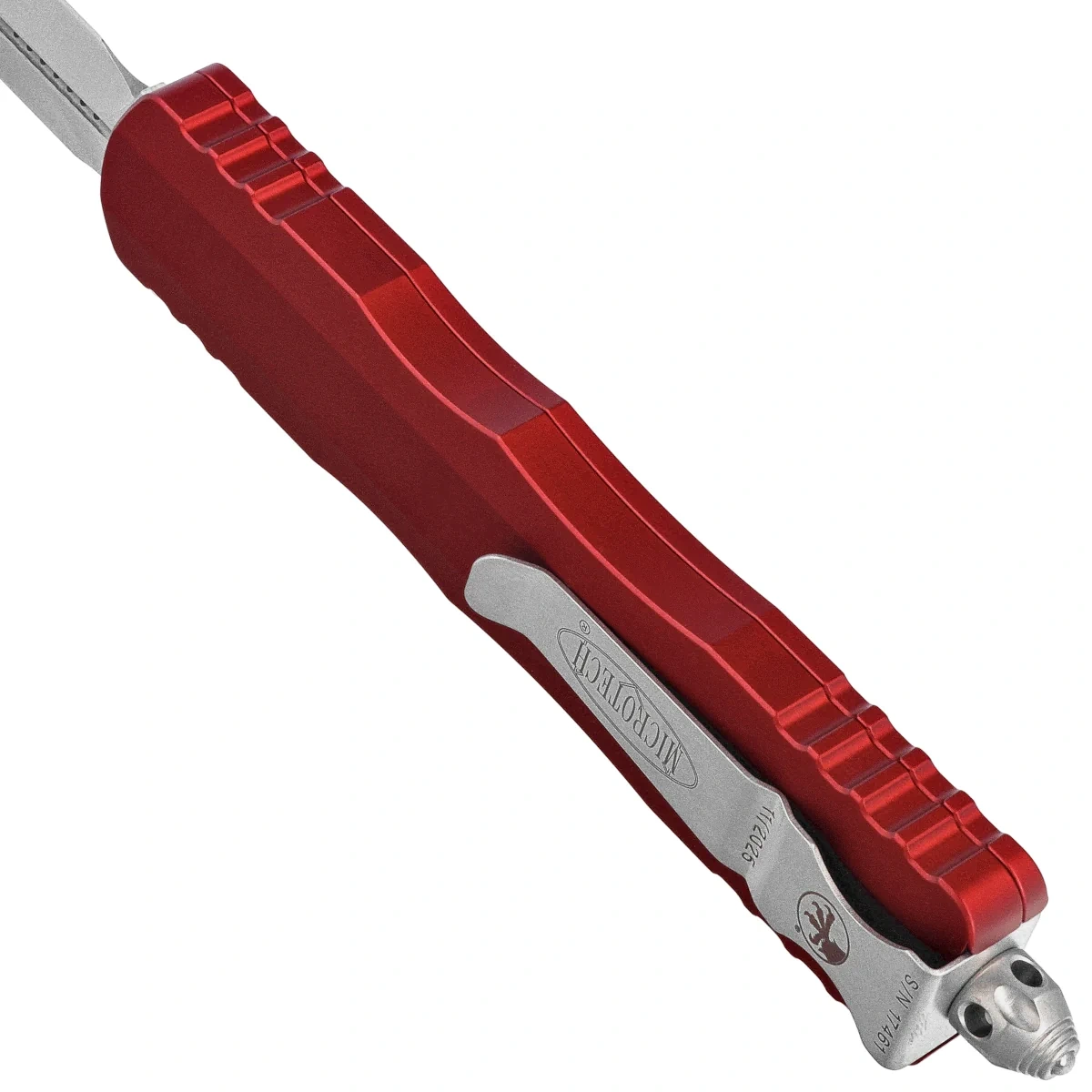 Handle - made with excellent precision in 3D technology on CNC milling machines, from Mil-Spec coated aluminum 6061-T6. The surface texture of the Handle makes the knife non-slip in the hand during use. There are notches (jimping) on the back and bottom of the handle for a more secure grip. A distinctive feature is the location of the slider, in a recess milled into the side of the handle. This allows the hand to lay more naturally when opening and closing the knife. The slim profile and the milled two-position (right/left) solid deep-carry clip allow the knife to be carried discreetly in the pocket, in tip-down (blade tip down) position. The clip bears the Microtech logo, serial number and production date. The Handle is finished with glass breaker, a solid steel triangle, into which a tungsten carbide ball has been pressed.