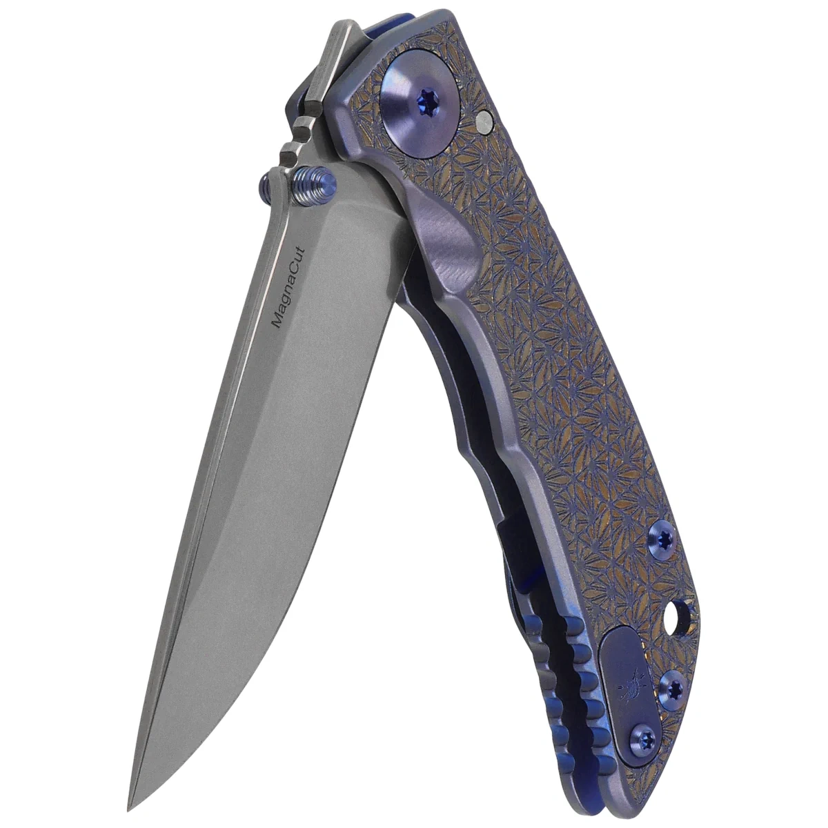Handle - made of titanium 6AL4V has beveled edges of the covers, eliminating sharp points. The surface is decorated with an artistic engraving of a geometric floral pattern. The so-called open-backed design without the typical backspacer, attached to each other with titanium spacer sleeves for easy cleaning. The simple but solid construction guarantees many years of use. There are notches (jimping) on the edges of the Handle, improving grip security. The axis of the pivot is decorated with a designer screw, and all fasteners (screws, clip) in gray. A double-sided (right/left) titanium clip, decorated with an arrow motif, allows the knife to be carried in tip-up position. Above the clip there is a hole designed for threading a safety cord.