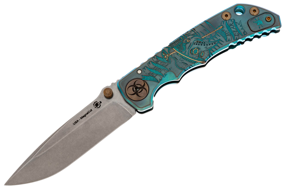 The solid titanium handle is decorated with an artistic engraving of “Plague Doctor”. Thanks to the properly contoured handle, the knife sits securely in the hand, ensuring precision when performing a variety of activities. A robust frame lock mechanism guarantees safe use even in extreme conditions. Each piece is handmade in the USA, making it a valuable and sought-after item among both collectors and discerning users.